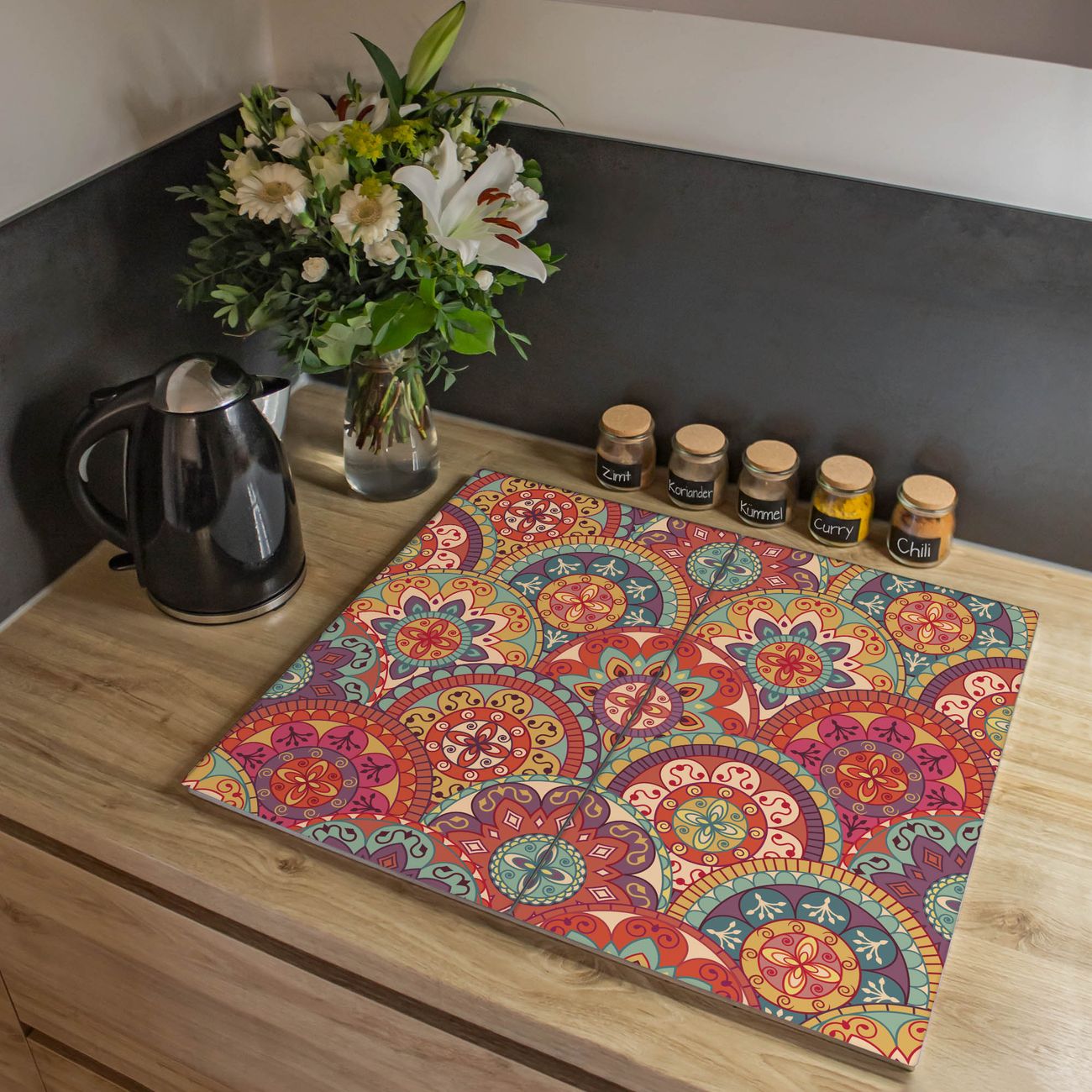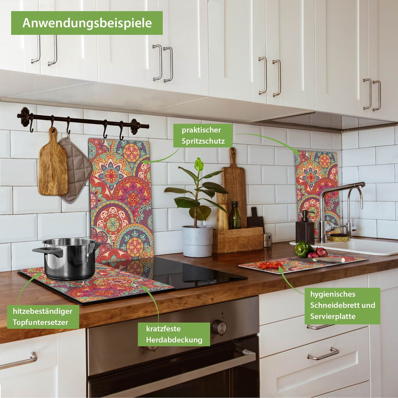 VIELSEITIG: Die Ceranfeldabdeckung ist vielseitig einsetzbar: ob als Spritzschutz hinter dem Herd für Ihre Küche oder als Glas Schneidebrett als hygienische und geruchsneutrale Unterlage. Sie können ebenfalls heiße Töpfe und Pfannen bis 100°C auf der Herdplattenabdeckung abstellen. Sie erhalten ein Multitalent für Ihre Küche. Die banjado Herdabdeckplatte aus Glas mit Motiv Rosetten verdeckt mit einem schönen Motiv Ihr Ceranfeld bzw. Ihren Induktionsherd. Die Herdabdeckplatte ist vielseitig einsetzbar und passt sich dabei Ihrem Einrichtungsstil an. DESIGN: Die Herdabdeckung Rosetten besteht aus hochwertigem, gehärtetem Glas mit einem unserer zahlreichen Motive. Sie haben die Wahl zwischen verschiedenen Maßen von einteiligen, zweiteiligen und einer dreiteiligen Herdabdeckung. Wählen Sie was zu Ihrer Einrichtung passt! DETAILS: Die Herdabdeckplatte ist vielseitig einsetzbar. Die Ecken sind für mehr Sicherheit dezent abgerundet, das Glas ist gehärtet. Sie erhalten separate Gummi Abstandshalter, damit Ihre Abdeckung rutschfest auf dem Herd steht. Diese können Sie frei positionieren, sodass die Herdabdeckung perfekt auf Ihrem Ceranfeld sitzt. BANJADO: Wir sind ein kleines Team aus dem Herzen von Sachsen und fertigen jeden Artikel nach Bestellung eigens für Sie an. Sie erhalten also keine preiswerte Importware, sondern Handarbeit. Auf Wunsch sind auch andere Farben und Größen möglich, kontakierten Sie uns gern.