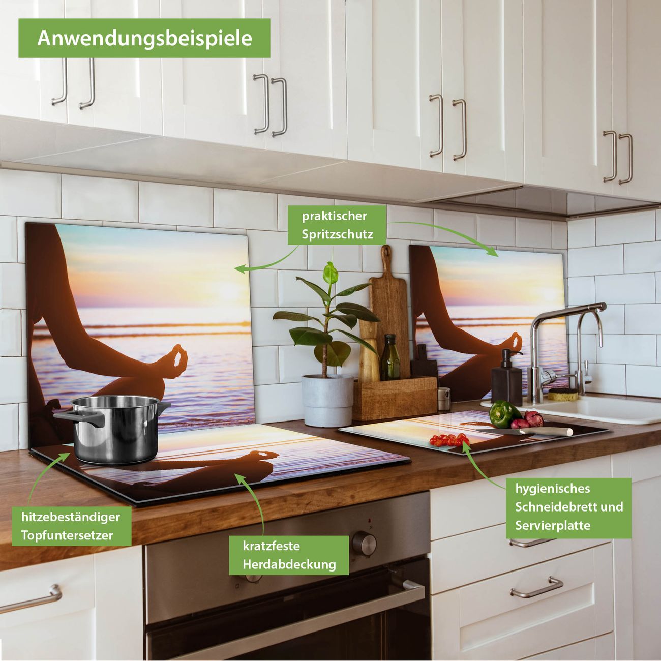 VIELSEITIG: Die Ceranfeldabdeckung ist vielseitig einsetzbar: ob als Spritzschutz hinter dem Herd für Ihre Küche oder als Glas Schneidebrett als hygienische und geruchsneutrale Unterlage. Sie können ebenfalls heiße Töpfe und Pfannen bis 100°C auf der Herdplattenabdeckung abstellen. Sie erhalten ein Multitalent für Ihre Küche. Die banjado Herdabdeckplatte aus Glas mit Motiv Ruhe verdeckt mit einem schönen Motiv Ihr Ceranfeld bzw. Ihren Induktionsherd. Die Herdabdeckplatte ist vielseitig einsetzbar und passt sich dabei Ihrem Einrichtungsstil an. DESIGN: Die Herdabdeckung Ruhe besteht aus hochwertigem, gehärtetem Glas mit einem unserer zahlreichen Motive. Sie haben die Wahl zwischen verschiedenen Maßen von einteiligen, zweiteiligen und einer dreiteiligen Herdabdeckung. Wählen Sie was zu Ihrer Einrichtung passt! DETAILS: Die Herdabdeckplatte ist vielseitig einsetzbar. Die Ecken sind für mehr Sicherheit dezent abgerundet, das Glas ist gehärtet. Sie erhalten separate Gummi Abstandshalter, damit Ihre Abdeckung rutschfest auf dem Herd steht. Diese können Sie frei positionieren, sodass die Herdabdeckung perfekt auf Ihrem Ceranfeld sitzt. BANJADO: Wir sind ein kleines Team aus dem Herzen von Sachsen und fertigen jeden Artikel nach Bestellung eigens für Sie an. Sie erhalten also keine preiswerte Importware, sondern Handarbeit. Auf Wunsch sind auch andere Farben und Größen möglich, kontakierten Sie uns gern.