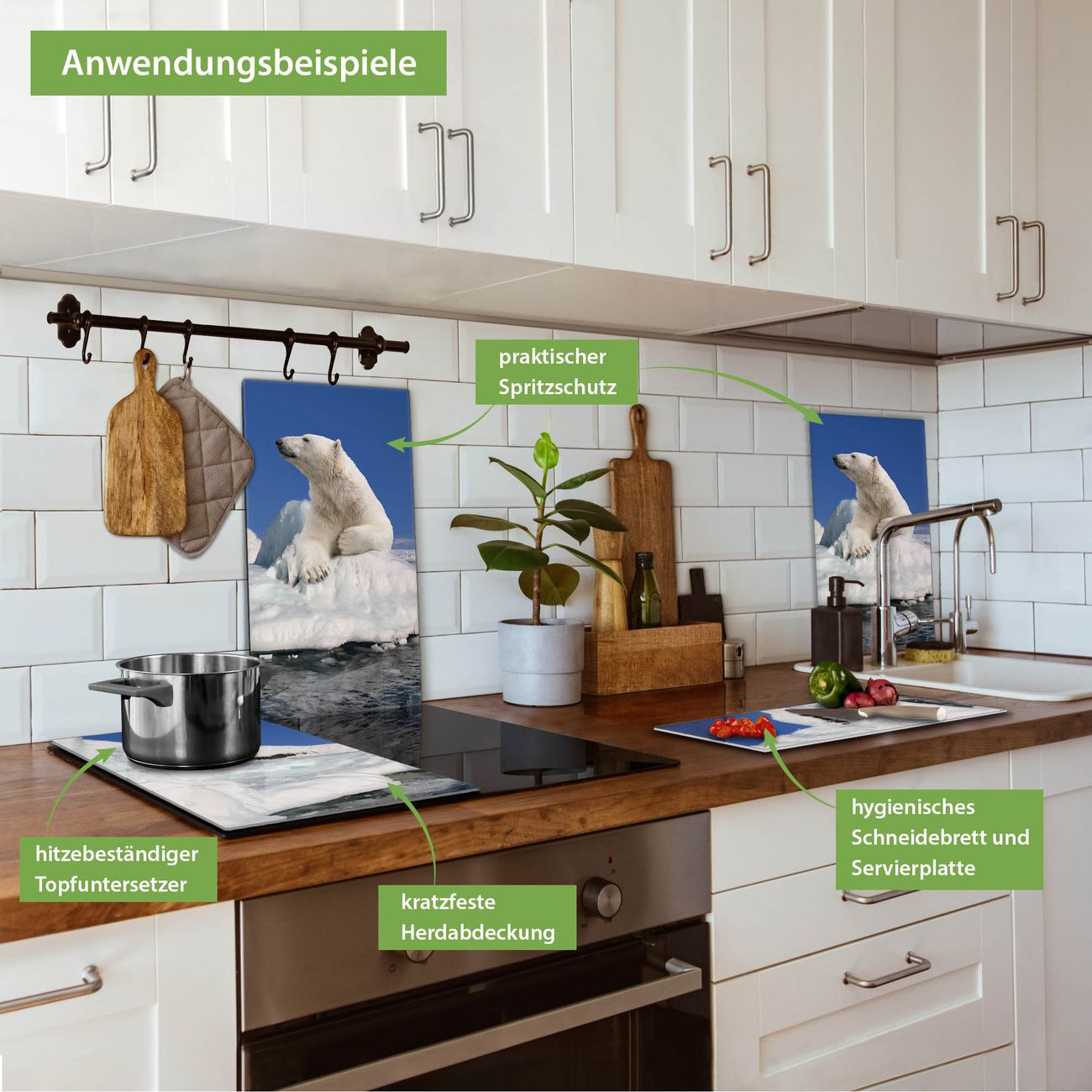 VIELSEITIG: Die Ceranfeldabdeckung ist vielseitig einsetzbar: ob als Spritzschutz hinter dem Herd für Ihre Küche oder als Glas Schneidebrett als hygienische und geruchsneutrale Unterlage. Sie können ebenfalls heiße Töpfe und Pfannen bis 100°C auf der Herdplattenabdeckung abstellen. Sie erhalten ein Multitalent für Ihre Küche. Die banjado Herdabdeckplatte aus Glas mit Motiv Ruhender Eisbär verdeckt mit einem schönen Motiv Ihr Ceranfeld bzw. Ihren Induktionsherd. Die Herdabdeckplatte ist vielseitig einsetzbar und passt sich dabei Ihrem Einrichtungsstil an. DESIGN: Die Herdabdeckung Ruhender Eisbär besteht aus hochwertigem, gehärtetem Glas mit einem unserer zahlreichen Motive. Sie haben die Wahl zwischen verschiedenen Maßen von einteiligen, zweiteiligen und einer dreiteiligen Herdabdeckung. Wählen Sie was zu Ihrer Einrichtung passt! DETAILS: Die Herdabdeckplatte ist vielseitig einsetzbar. Die Ecken sind für mehr Sicherheit dezent abgerundet, das Glas ist gehärtet. Sie erhalten separate Gummi Abstandshalter, damit Ihre Abdeckung rutschfest auf dem Herd steht. Diese können Sie frei positionieren, sodass die Herdabdeckung perfekt auf Ihrem Ceranfeld sitzt. BANJADO: Wir sind ein kleines Team aus dem Herzen von Sachsen und fertigen jeden Artikel nach Bestellung eigens für Sie an. Sie erhalten also keine preiswerte Importware, sondern Handarbeit. Auf Wunsch sind auch andere Farben und Größen möglich, kontakierten Sie uns gern.