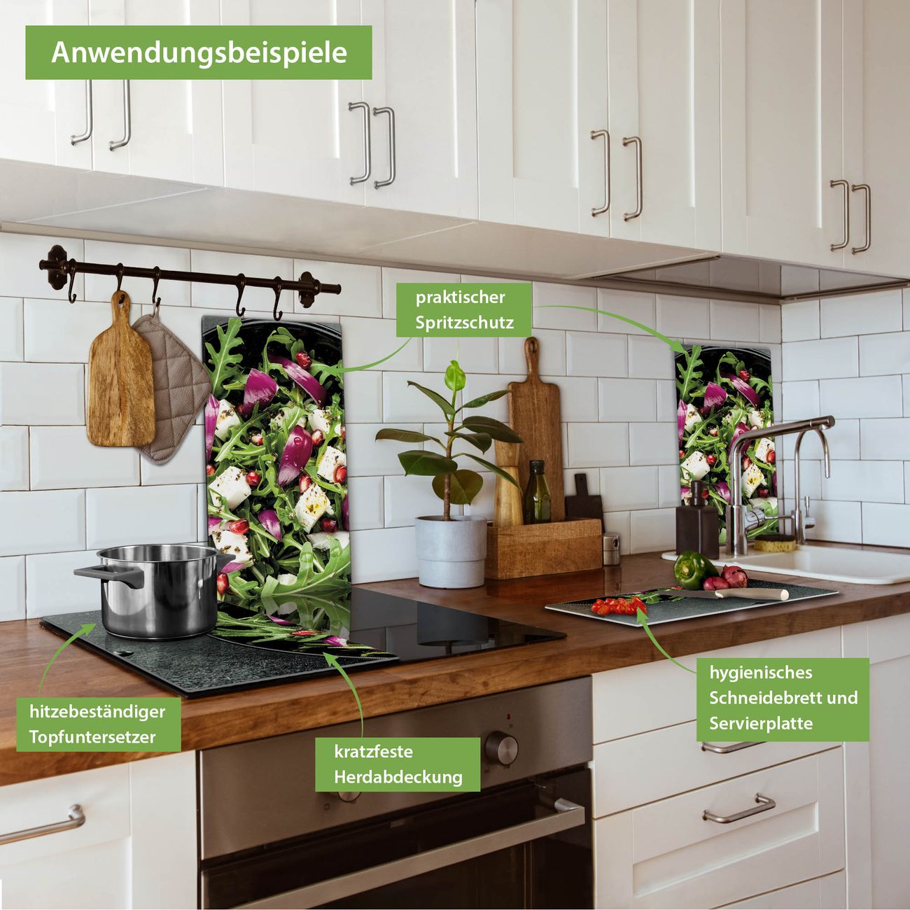 VIELSEITIG: Die Ceranfeldabdeckung ist vielseitig einsetzbar: ob als Spritzschutz hinter dem Herd für Ihre Küche oder als Glas Schneidebrett als hygienische und geruchsneutrale Unterlage. Sie können ebenfalls heiße Töpfe und Pfannen bis 100°C auf der Herdplattenabdeckung abstellen. Sie erhalten ein Multitalent für Ihre Küche. Die banjado Herdabdeckplatte aus Glas mit Motiv Salat verdeckt mit einem schönen Motiv Ihr Ceranfeld bzw. Ihren Induktionsherd. Die Herdabdeckplatte ist vielseitig einsetzbar und passt sich dabei Ihrem Einrichtungsstil an. DESIGN: Die Herdabdeckung Salat besteht aus hochwertigem, gehärtetem Glas mit einem unserer zahlreichen Motive. Sie haben die Wahl zwischen verschiedenen Maßen von einteiligen, zweiteiligen und einer dreiteiligen Herdabdeckung. Wählen Sie was zu Ihrer Einrichtung passt! DETAILS: Die Herdabdeckplatte ist vielseitig einsetzbar. Die Ecken sind für mehr Sicherheit dezent abgerundet, das Glas ist gehärtet. Sie erhalten separate Gummi Abstandshalter, damit Ihre Abdeckung rutschfest auf dem Herd steht. Diese können Sie frei positionieren, sodass die Herdabdeckung perfekt auf Ihrem Ceranfeld sitzt. BANJADO: Wir sind ein kleines Team aus dem Herzen von Sachsen und fertigen jeden Artikel nach Bestellung eigens für Sie an. Sie erhalten also keine preiswerte Importware, sondern Handarbeit. Auf Wunsch sind auch andere Farben und Größen möglich, kontakierten Sie uns gern.