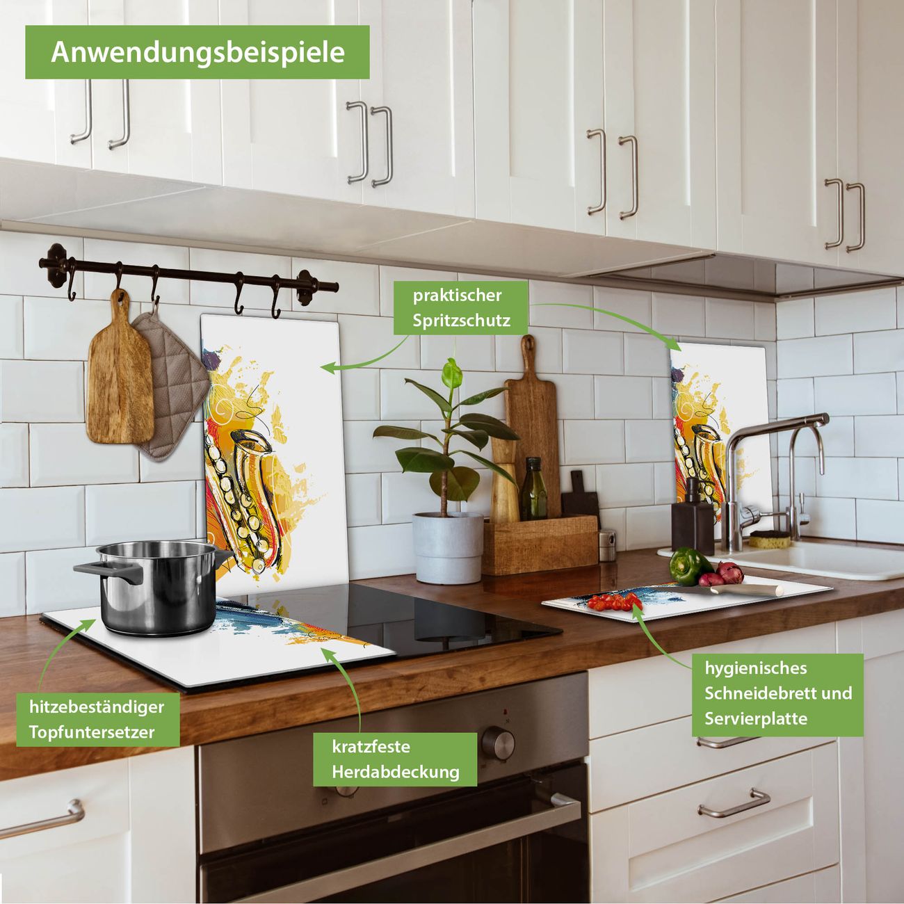VIELSEITIG: Die Ceranfeldabdeckung ist vielseitig einsetzbar: ob als Spritzschutz hinter dem Herd für Ihre Küche oder als Glas Schneidebrett als hygienische und geruchsneutrale Unterlage. Sie können ebenfalls heiße Töpfe und Pfannen bis 100°C auf der Herdplattenabdeckung abstellen. Sie erhalten ein Multitalent für Ihre Küche. Die banjado Herdabdeckplatte aus Glas mit Motiv Saxophon verdeckt mit einem schönen Motiv Ihr Ceranfeld bzw. Ihren Induktionsherd. Die Herdabdeckplatte ist vielseitig einsetzbar und passt sich dabei Ihrem Einrichtungsstil an. DESIGN: Die Herdabdeckung Saxophon besteht aus hochwertigem, gehärtetem Glas mit einem unserer zahlreichen Motive. Sie haben die Wahl zwischen verschiedenen Maßen von einteiligen, zweiteiligen und einer dreiteiligen Herdabdeckung. Wählen Sie was zu Ihrer Einrichtung passt! DETAILS: Die Herdabdeckplatte ist vielseitig einsetzbar. Die Ecken sind für mehr Sicherheit dezent abgerundet, das Glas ist gehärtet. Sie erhalten separate Gummi Abstandshalter, damit Ihre Abdeckung rutschfest auf dem Herd steht. Diese können Sie frei positionieren, sodass die Herdabdeckung perfekt auf Ihrem Ceranfeld sitzt. BANJADO: Wir sind ein kleines Team aus dem Herzen von Sachsen und fertigen jeden Artikel nach Bestellung eigens für Sie an. Sie erhalten also keine preiswerte Importware, sondern Handarbeit. Auf Wunsch sind auch andere Farben und Größen möglich, kontakierten Sie uns gern.
