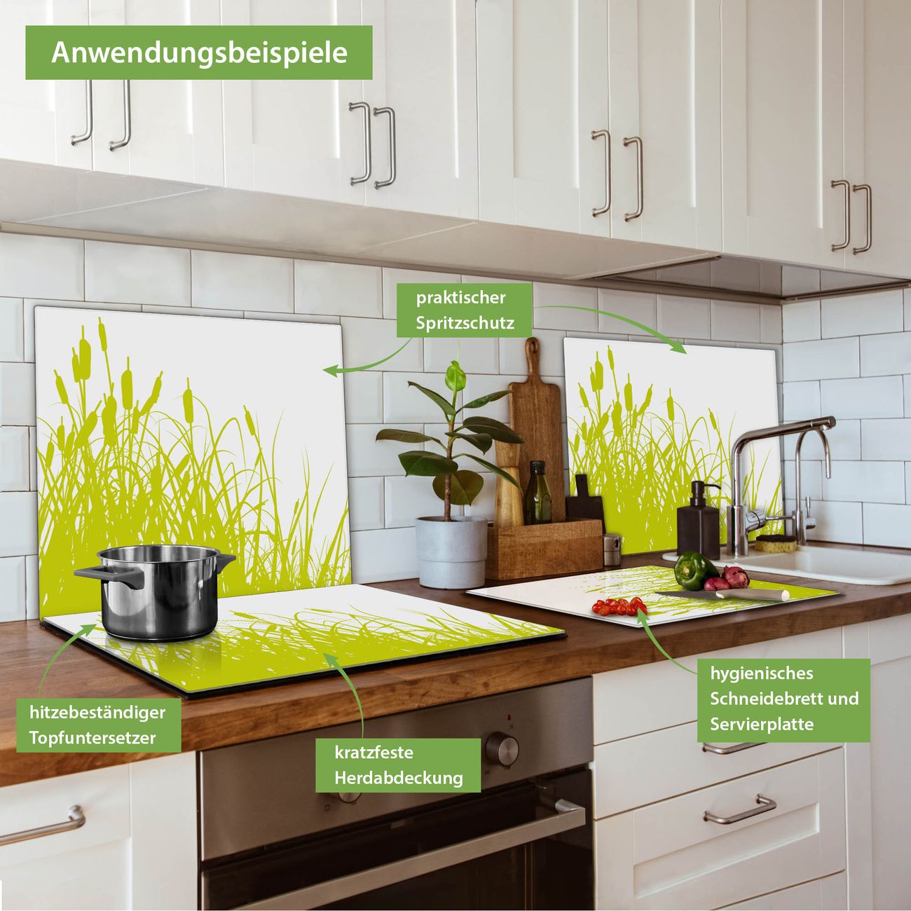 VIELSEITIG: Die Ceranfeldabdeckung ist vielseitig einsetzbar: ob als Spritzschutz hinter dem Herd für Ihre Küche oder als Glas Schneidebrett als hygienische und geruchsneutrale Unterlage. Sie können ebenfalls heiße Töpfe und Pfannen bis 100°C auf der Herdplattenabdeckung abstellen. Sie erhalten ein Multitalent für Ihre Küche. Die banjado Herdabdeckplatte aus Glas mit Motiv Schilf verdeckt mit einem schönen Motiv Ihr Ceranfeld bzw. Ihren Induktionsherd. Die Herdabdeckplatte ist vielseitig einsetzbar und passt sich dabei Ihrem Einrichtungsstil an. DESIGN: Die Herdabdeckung Schilf besteht aus hochwertigem, gehärtetem Glas mit einem unserer zahlreichen Motive. Sie haben die Wahl zwischen verschiedenen Maßen von einteiligen, zweiteiligen und einer dreiteiligen Herdabdeckung. Wählen Sie was zu Ihrer Einrichtung passt! DETAILS: Die Herdabdeckplatte ist vielseitig einsetzbar. Die Ecken sind für mehr Sicherheit dezent abgerundet, das Glas ist gehärtet. Sie erhalten separate Gummi Abstandshalter, damit Ihre Abdeckung rutschfest auf dem Herd steht. Diese können Sie frei positionieren, sodass die Herdabdeckung perfekt auf Ihrem Ceranfeld sitzt. BANJADO: Wir sind ein kleines Team aus dem Herzen von Sachsen und fertigen jeden Artikel nach Bestellung eigens für Sie an. Sie erhalten also keine preiswerte Importware, sondern Handarbeit. Auf Wunsch sind auch andere Farben und Größen möglich, kontakierten Sie uns gern.
