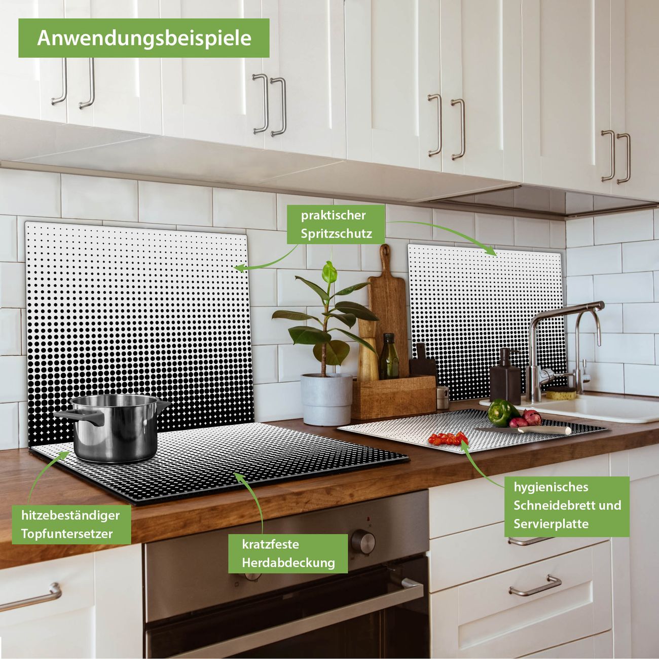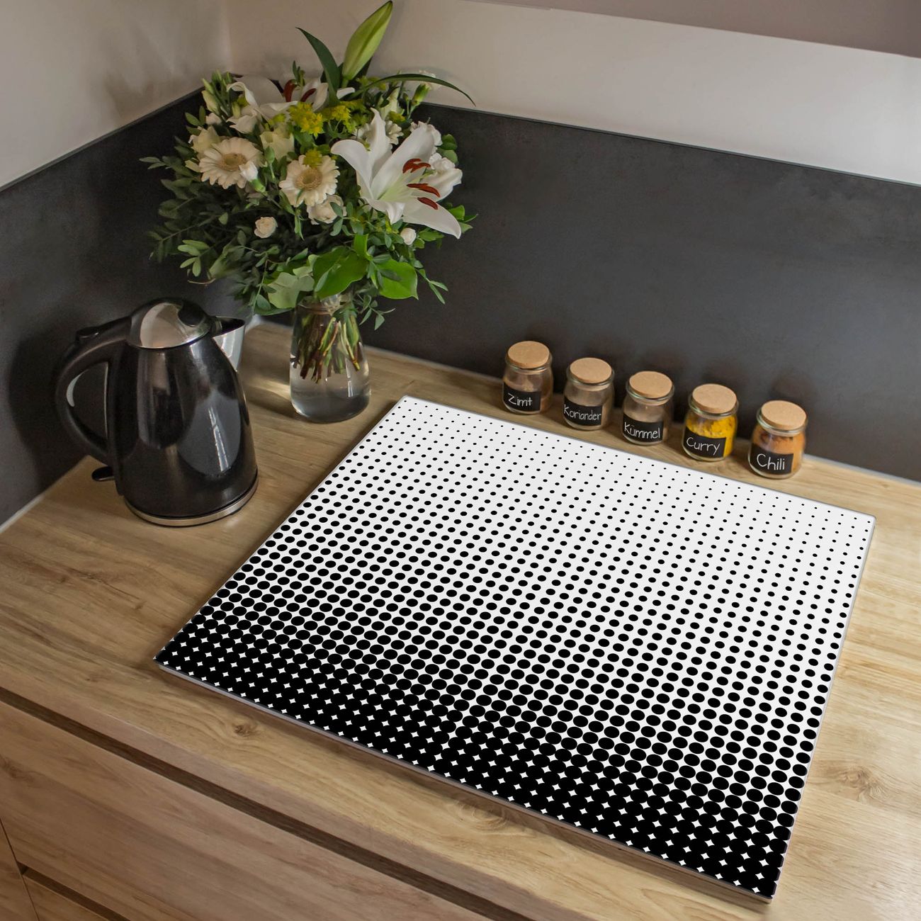 VIELSEITIG: Die Ceranfeldabdeckung ist vielseitig einsetzbar: ob als Spritzschutz hinter dem Herd für Ihre Küche oder als Glas Schneidebrett als hygienische und geruchsneutrale Unterlage. Sie können ebenfalls heiße Töpfe und Pfannen bis 100°C auf der Herdplattenabdeckung abstellen. Sie erhalten ein Multitalent für Ihre Küche. Die banjado Herdabdeckplatte aus Glas mit Motiv Schwarz Weiß verdeckt mit einem schönen Motiv Ihr Ceranfeld bzw. Ihren Induktionsherd. Die Herdabdeckplatte ist vielseitig einsetzbar und passt sich dabei Ihrem Einrichtungsstil an. DESIGN: Die Herdabdeckung Schwarz Weiß besteht aus hochwertigem, gehärtetem Glas mit einem unserer zahlreichen Motive. Sie haben die Wahl zwischen verschiedenen Maßen von einteiligen, zweiteiligen und einer dreiteiligen Herdabdeckung. Wählen Sie was zu Ihrer Einrichtung passt! DETAILS: Die Herdabdeckplatte ist vielseitig einsetzbar. Die Ecken sind für mehr Sicherheit dezent abgerundet, das Glas ist gehärtet. Sie erhalten separate Gummi Abstandshalter, damit Ihre Abdeckung rutschfest auf dem Herd steht. Diese können Sie frei positionieren, sodass die Herdabdeckung perfekt auf Ihrem Ceranfeld sitzt. BANJADO: Wir sind ein kleines Team aus dem Herzen von Sachsen und fertigen jeden Artikel nach Bestellung eigens für Sie an. Sie erhalten also keine preiswerte Importware, sondern Handarbeit. Auf Wunsch sind auch andere Farben und Größen möglich, kontakierten Sie uns gern.