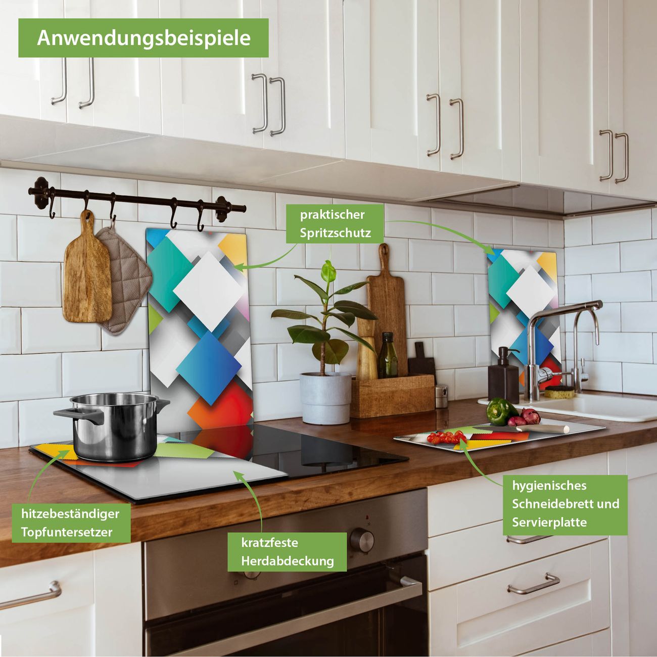 VIELSEITIG: Die Ceranfeldabdeckung ist vielseitig einsetzbar: ob als Spritzschutz hinter dem Herd für Ihre Küche oder als Glas Schneidebrett als hygienische und geruchsneutrale Unterlage. Sie können ebenfalls heiße Töpfe und Pfannen bis 100°C auf der Herdplattenabdeckung abstellen. Sie erhalten ein Multitalent für Ihre Küche. Die banjado Herdabdeckplatte aus Glas mit Motiv Schwebende Quadrate verdeckt mit einem schönen Motiv Ihr Ceranfeld bzw. Ihren Induktionsherd. Die Herdabdeckplatte ist vielseitig einsetzbar und passt sich dabei Ihrem Einrichtungsstil an. DESIGN: Die Herdabdeckung Schwebende Quadrate besteht aus hochwertigem, gehärtetem Glas mit einem unserer zahlreichen Motive. Sie haben die Wahl zwischen verschiedenen Maßen von einteiligen, zweiteiligen und einer dreiteiligen Herdabdeckung. Wählen Sie was zu Ihrer Einrichtung passt! DETAILS: Die Herdabdeckplatte ist vielseitig einsetzbar. Die Ecken sind für mehr Sicherheit dezent abgerundet, das Glas ist gehärtet. Sie erhalten separate Gummi Abstandshalter, damit Ihre Abdeckung rutschfest auf dem Herd steht. Diese können Sie frei positionieren, sodass die Herdabdeckung perfekt auf Ihrem Ceranfeld sitzt. BANJADO: Wir sind ein kleines Team aus dem Herzen von Sachsen und fertigen jeden Artikel nach Bestellung eigens für Sie an. Sie erhalten also keine preiswerte Importware, sondern Handarbeit. Auf Wunsch sind auch andere Farben und Größen möglich, kontakierten Sie uns gern.