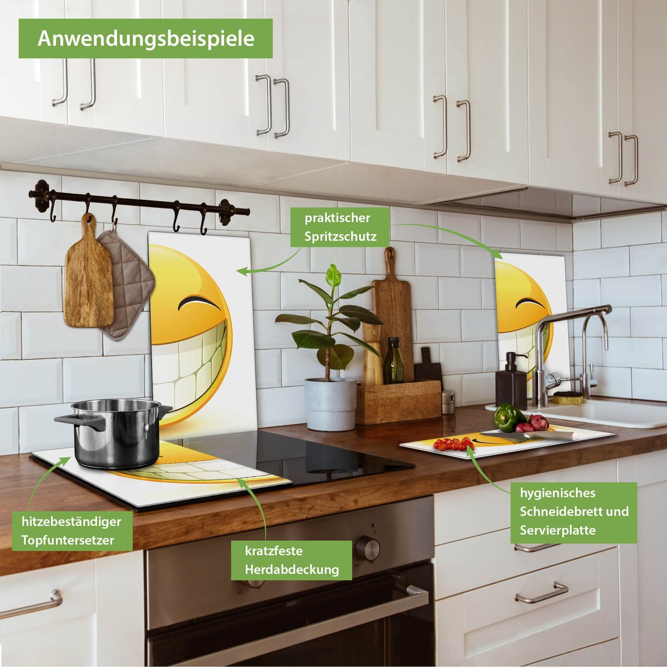 VIELSEITIG: Die Ceranfeldabdeckung ist vielseitig einsetzbar: ob als Spritzschutz hinter dem Herd für Ihre Küche oder als Glas Schneidebrett als hygienische und geruchsneutrale Unterlage. Sie können ebenfalls heiße Töpfe und Pfannen bis 100°C auf der Herdplattenabdeckung abstellen. Sie erhalten ein Multitalent für Ihre Küche. Die banjado Herdabdeckplatte aus Glas mit Motiv Smile verdeckt mit einem schönen Motiv Ihr Ceranfeld bzw. Ihren Induktionsherd. Die Herdabdeckplatte ist vielseitig einsetzbar und passt sich dabei Ihrem Einrichtungsstil an. DESIGN: Die Herdabdeckung Smile besteht aus hochwertigem, gehärtetem Glas mit einem unserer zahlreichen Motive. Sie haben die Wahl zwischen verschiedenen Maßen von einteiligen, zweiteiligen und einer dreiteiligen Herdabdeckung. Wählen Sie was zu Ihrer Einrichtung passt! DETAILS: Die Herdabdeckplatte ist vielseitig einsetzbar. Die Ecken sind für mehr Sicherheit dezent abgerundet, das Glas ist gehärtet. Sie erhalten separate Gummi Abstandshalter, damit Ihre Abdeckung rutschfest auf dem Herd steht. Diese können Sie frei positionieren, sodass die Herdabdeckung perfekt auf Ihrem Ceranfeld sitzt. BANJADO: Wir sind ein kleines Team aus dem Herzen von Sachsen und fertigen jeden Artikel nach Bestellung eigens für Sie an. Sie erhalten also keine preiswerte Importware, sondern Handarbeit. Auf Wunsch sind auch andere Farben und Größen möglich, kontakierten Sie uns gern.