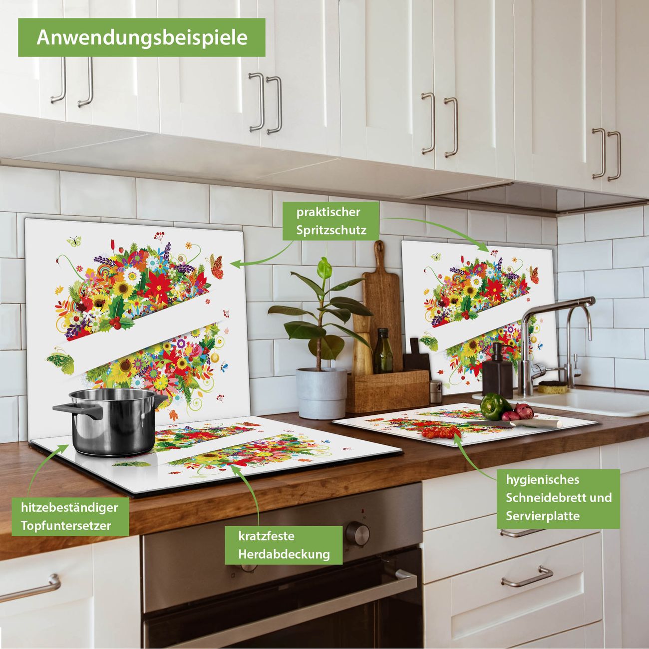 VIELSEITIG: Die Ceranfeldabdeckung ist vielseitig einsetzbar: ob als Spritzschutz hinter dem Herd für Ihre Küche oder als Glas Schneidebrett als hygienische und geruchsneutrale Unterlage. Sie können ebenfalls heiße Töpfe und Pfannen bis 100°C auf der Herdplattenabdeckung abstellen. Sie erhalten ein Multitalent für Ihre Küche. Die banjado Herdabdeckplatte aus Glas mit Motiv Sommer verdeckt mit einem schönen Motiv Ihr Ceranfeld bzw. Ihren Induktionsherd. Die Herdabdeckplatte ist vielseitig einsetzbar und passt sich dabei Ihrem Einrichtungsstil an. DESIGN: Die Herdabdeckung Sommer besteht aus hochwertigem, gehärtetem Glas mit einem unserer zahlreichen Motive. Sie haben die Wahl zwischen verschiedenen Maßen von einteiligen, zweiteiligen und einer dreiteiligen Herdabdeckung. Wählen Sie was zu Ihrer Einrichtung passt! DETAILS: Die Herdabdeckplatte ist vielseitig einsetzbar. Die Ecken sind für mehr Sicherheit dezent abgerundet, das Glas ist gehärtet. Sie erhalten separate Gummi Abstandshalter, damit Ihre Abdeckung rutschfest auf dem Herd steht. Diese können Sie frei positionieren, sodass die Herdabdeckung perfekt auf Ihrem Ceranfeld sitzt. BANJADO: Wir sind ein kleines Team aus dem Herzen von Sachsen und fertigen jeden Artikel nach Bestellung eigens für Sie an. Sie erhalten also keine preiswerte Importware, sondern Handarbeit. Auf Wunsch sind auch andere Farben und Größen möglich, kontakierten Sie uns gern.