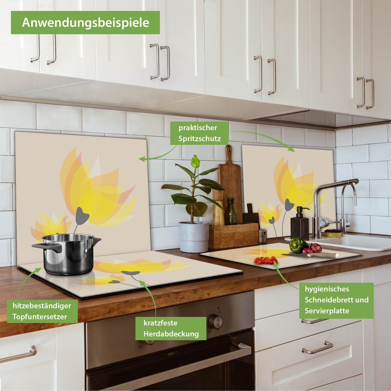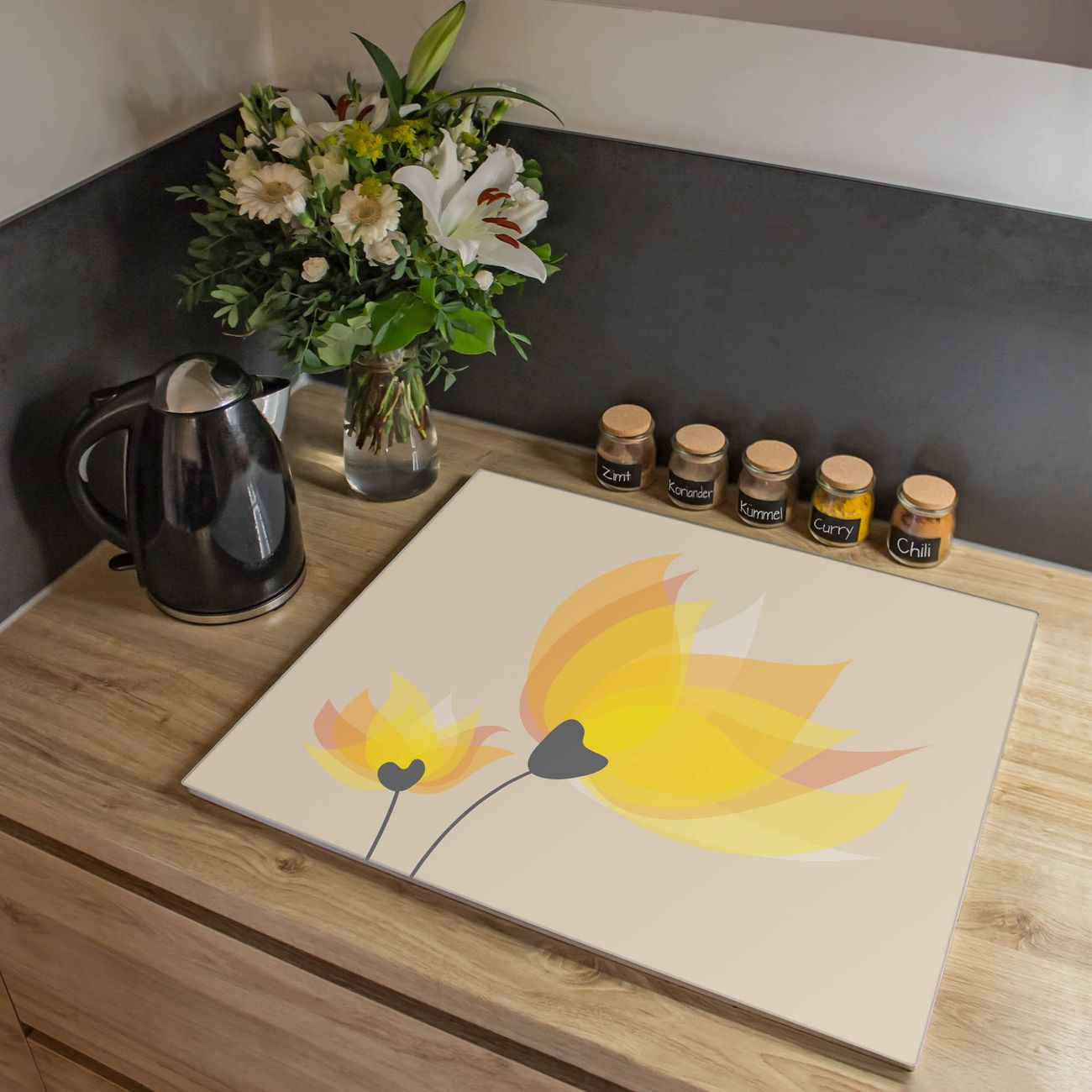 VIELSEITIG: Die Ceranfeldabdeckung ist vielseitig einsetzbar: ob als Spritzschutz hinter dem Herd für Ihre Küche oder als Glas Schneidebrett als hygienische und geruchsneutrale Unterlage. Sie können ebenfalls heiße Töpfe und Pfannen bis 100°C auf der Herdplattenabdeckung abstellen. Sie erhalten ein Multitalent für Ihre Küche. Die banjado Herdabdeckplatte aus Glas mit Motiv Sommerblüten verdeckt mit einem schönen Motiv Ihr Ceranfeld bzw. Ihren Induktionsherd. Die Herdabdeckplatte ist vielseitig einsetzbar und passt sich dabei Ihrem Einrichtungsstil an. DESIGN: Die Herdabdeckung Sommerblüten besteht aus hochwertigem, gehärtetem Glas mit einem unserer zahlreichen Motive. Sie haben die Wahl zwischen verschiedenen Maßen von einteiligen, zweiteiligen und einer dreiteiligen Herdabdeckung. Wählen Sie was zu Ihrer Einrichtung passt! DETAILS: Die Herdabdeckplatte ist vielseitig einsetzbar. Die Ecken sind für mehr Sicherheit dezent abgerundet, das Glas ist gehärtet. Sie erhalten separate Gummi Abstandshalter, damit Ihre Abdeckung rutschfest auf dem Herd steht. Diese können Sie frei positionieren, sodass die Herdabdeckung perfekt auf Ihrem Ceranfeld sitzt. BANJADO: Wir sind ein kleines Team aus dem Herzen von Sachsen und fertigen jeden Artikel nach Bestellung eigens für Sie an. Sie erhalten also keine preiswerte Importware, sondern Handarbeit. Auf Wunsch sind auch andere Farben und Größen möglich, kontakierten Sie uns gern.
