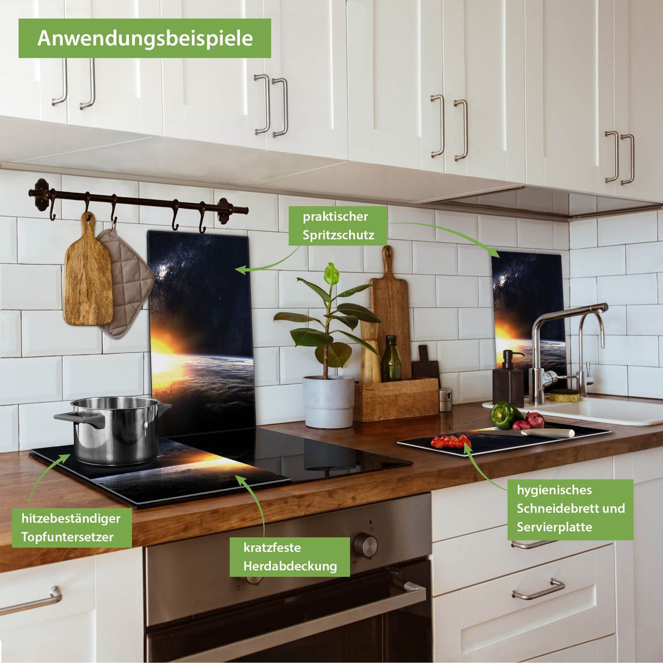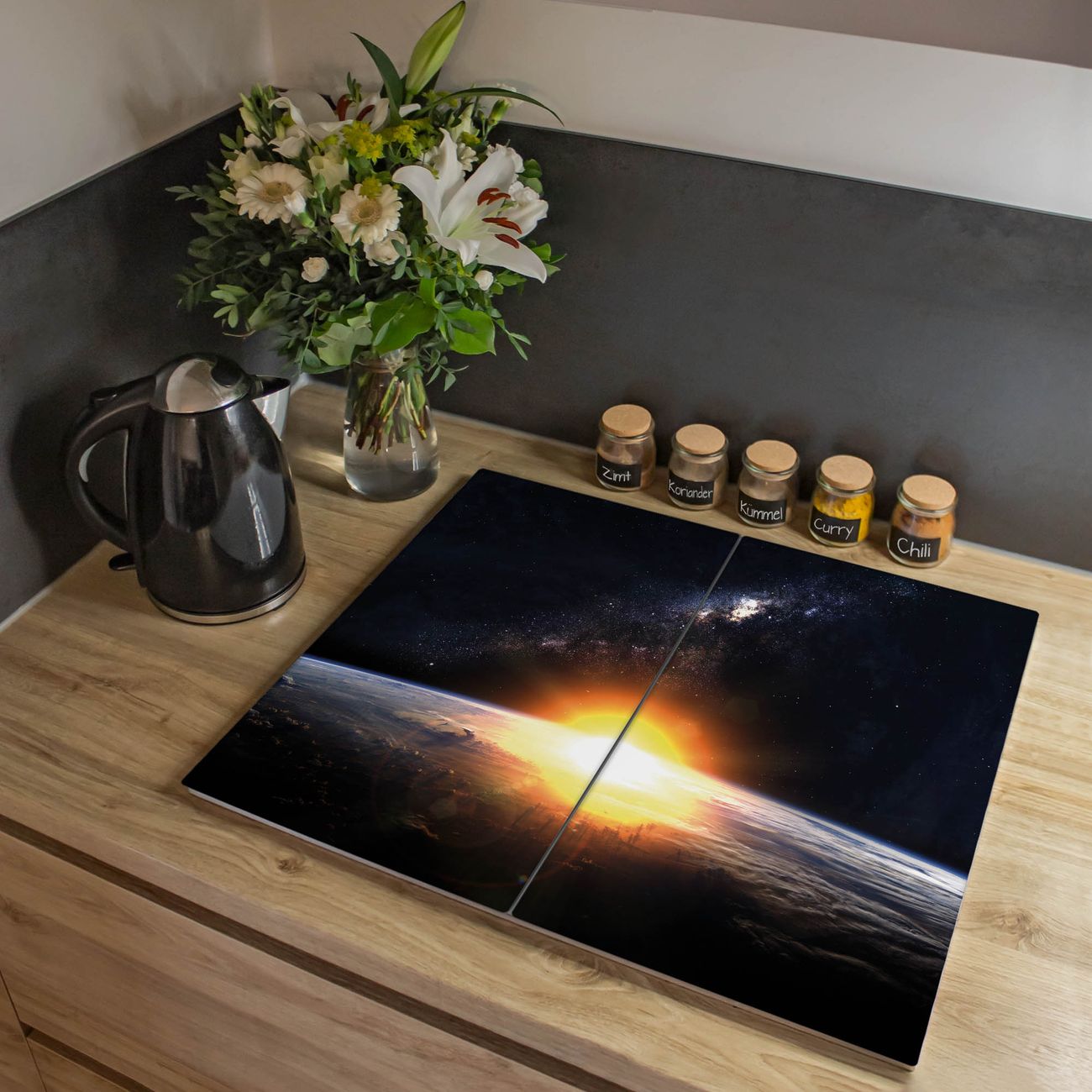 VIELSEITIG: Die Ceranfeldabdeckung ist vielseitig einsetzbar: ob als Spritzschutz hinter dem Herd für Ihre Küche oder als Glas Schneidebrett als hygienische und geruchsneutrale Unterlage. Sie können ebenfalls heiße Töpfe und Pfannen bis 100°C auf der Herdplattenabdeckung abstellen. Sie erhalten ein Multitalent für Ihre Küche. Die banjado Herdabdeckplatte aus Glas mit Motiv Sonne im Weltall verdeckt mit einem schönen Motiv Ihr Ceranfeld bzw. Ihren Induktionsherd. Die Herdabdeckplatte ist vielseitig einsetzbar und passt sich dabei Ihrem Einrichtungsstil an. DESIGN: Die Herdabdeckung Sonne im Weltall besteht aus hochwertigem, gehärtetem Glas mit einem unserer zahlreichen Motive. Sie haben die Wahl zwischen verschiedenen Maßen von einteiligen, zweiteiligen und einer dreiteiligen Herdabdeckung. Wählen Sie was zu Ihrer Einrichtung passt! DETAILS: Die Herdabdeckplatte ist vielseitig einsetzbar. Die Ecken sind für mehr Sicherheit dezent abgerundet, das Glas ist gehärtet. Sie erhalten separate Gummi Abstandshalter, damit Ihre Abdeckung rutschfest auf dem Herd steht. Diese können Sie frei positionieren, sodass die Herdabdeckung perfekt auf Ihrem Ceranfeld sitzt. BANJADO: Wir sind ein kleines Team aus dem Herzen von Sachsen und fertigen jeden Artikel nach Bestellung eigens für Sie an. Sie erhalten also keine preiswerte Importware, sondern Handarbeit. Auf Wunsch sind auch andere Farben und Größen möglich, kontakierten Sie uns gern.