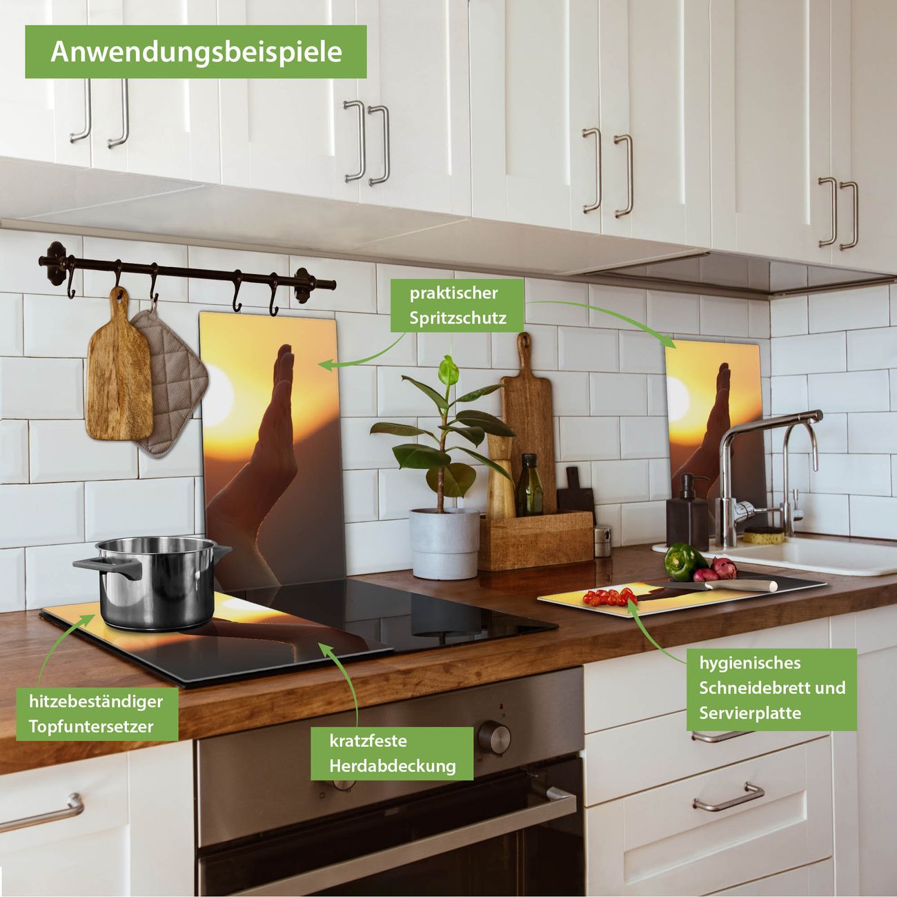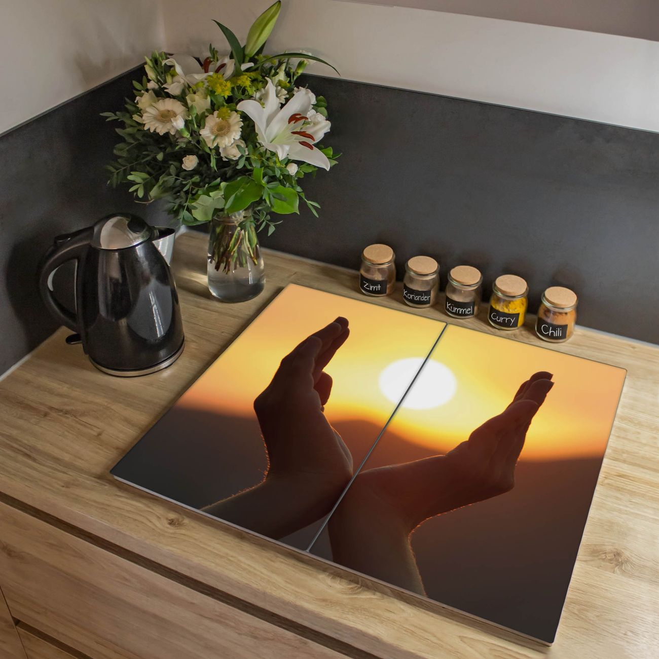 VIELSEITIG: Die Ceranfeldabdeckung ist vielseitig einsetzbar: ob als Spritzschutz hinter dem Herd für Ihre Küche oder als Glas Schneidebrett als hygienische und geruchsneutrale Unterlage. Sie können ebenfalls heiße Töpfe und Pfannen bis 100°C auf der Herdplattenabdeckung abstellen. Sie erhalten ein Multitalent für Ihre Küche. Die banjado Herdabdeckplatte aus Glas mit Motiv Sonnenanbeter verdeckt mit einem schönen Motiv Ihr Ceranfeld bzw. Ihren Induktionsherd. Die Herdabdeckplatte ist vielseitig einsetzbar und passt sich dabei Ihrem Einrichtungsstil an. DESIGN: Die Herdabdeckung Sonnenanbeter besteht aus hochwertigem, gehärtetem Glas mit einem unserer zahlreichen Motive. Sie haben die Wahl zwischen verschiedenen Maßen von einteiligen, zweiteiligen und einer dreiteiligen Herdabdeckung. Wählen Sie was zu Ihrer Einrichtung passt! DETAILS: Die Herdabdeckplatte ist vielseitig einsetzbar. Die Ecken sind für mehr Sicherheit dezent abgerundet, das Glas ist gehärtet. Sie erhalten separate Gummi Abstandshalter, damit Ihre Abdeckung rutschfest auf dem Herd steht. Diese können Sie frei positionieren, sodass die Herdabdeckung perfekt auf Ihrem Ceranfeld sitzt. BANJADO: Wir sind ein kleines Team aus dem Herzen von Sachsen und fertigen jeden Artikel nach Bestellung eigens für Sie an. Sie erhalten also keine preiswerte Importware, sondern Handarbeit. Auf Wunsch sind auch andere Farben und Größen möglich, kontakierten Sie uns gern.