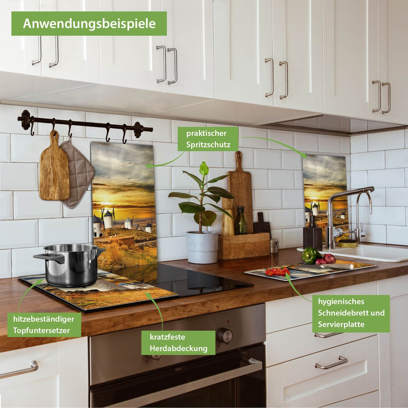 VIELSEITIG: Die Ceranfeldabdeckung ist vielseitig einsetzbar: ob als Spritzschutz hinter dem Herd für Ihre Küche oder als Glas Schneidebrett als hygienische und geruchsneutrale Unterlage. Sie können ebenfalls heiße Töpfe und Pfannen bis 100°C auf der Herdplattenabdeckung abstellen. Sie erhalten ein Multitalent für Ihre Küche. Die banjado Herdabdeckplatte aus Glas mit Motiv Spanische Windmühlen verdeckt mit einem schönen Motiv Ihr Ceranfeld bzw. Ihren Induktionsherd. Die Herdabdeckplatte ist vielseitig einsetzbar und passt sich dabei Ihrem Einrichtungsstil an. DESIGN: Die Herdabdeckung Spanische Windmühlen besteht aus hochwertigem, gehärtetem Glas mit einem unserer zahlreichen Motive. Sie haben die Wahl zwischen verschiedenen Maßen von einteiligen, zweiteiligen und einer dreiteiligen Herdabdeckung. Wählen Sie was zu Ihrer Einrichtung passt! DETAILS: Die Herdabdeckplatte ist vielseitig einsetzbar. Die Ecken sind für mehr Sicherheit dezent abgerundet, das Glas ist gehärtet. Sie erhalten separate Gummi Abstandshalter, damit Ihre Abdeckung rutschfest auf dem Herd steht. Diese können Sie frei positionieren, sodass die Herdabdeckung perfekt auf Ihrem Ceranfeld sitzt. BANJADO: Wir sind ein kleines Team aus dem Herzen von Sachsen und fertigen jeden Artikel nach Bestellung eigens für Sie an. Sie erhalten also keine preiswerte Importware, sondern Handarbeit. Auf Wunsch sind auch andere Farben und Größen möglich, kontakierten Sie uns gern.