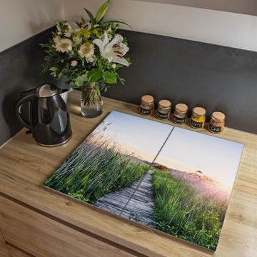 VIELSEITIG: Die Ceranfeldabdeckung ist vielseitig einsetzbar: ob als Spritzschutz hinter dem Herd für Ihre Küche oder als Glas Schneidebrett als hygienische und geruchsneutrale Unterlage. Sie können ebenfalls heiße Töpfe und Pfannen bis 100°C auf der Herdplattenabdeckung abstellen. Sie erhalten ein Multitalent für Ihre Küche. Die banjado Herdabdeckplatte aus Glas mit Motiv Steg Durchs Schilf verdeckt mit einem schönen Motiv Ihr Ceranfeld bzw. Ihren Induktionsherd. Die Herdabdeckplatte ist vielseitig einsetzbar und passt sich dabei Ihrem Einrichtungsstil an. DESIGN: Die Herdabdeckung Steg Durchs Schilf besteht aus hochwertigem, gehärtetem Glas mit einem unserer zahlreichen Motive. Sie haben die Wahl zwischen verschiedenen Maßen von einteiligen, zweiteiligen und einer dreiteiligen Herdabdeckung. Wählen Sie was zu Ihrer Einrichtung passt! DETAILS: Die Herdabdeckplatte ist vielseitig einsetzbar. Die Ecken sind für mehr Sicherheit dezent abgerundet, das Glas ist gehärtet. Sie erhalten separate Gummi Abstandshalter, damit Ihre Abdeckung rutschfest auf dem Herd steht. Diese können Sie frei positionieren, sodass die Herdabdeckung perfekt auf Ihrem Ceranfeld sitzt. BANJADO: Wir sind ein kleines Team aus dem Herzen von Sachsen und fertigen jeden Artikel nach Bestellung eigens für Sie an. Sie erhalten also keine preiswerte Importware, sondern Handarbeit. Auf Wunsch sind auch andere Farben und Größen möglich, kontakierten Sie uns gern.