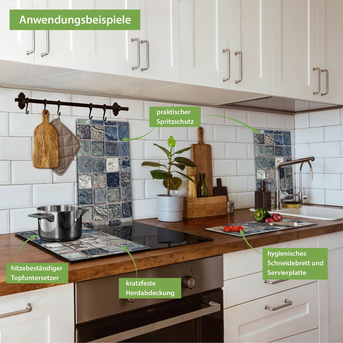 VIELSEITIG: Die Ceranfeldabdeckung ist vielseitig einsetzbar: ob als Spritzschutz hinter dem Herd für Ihre Küche oder als Glas Schneidebrett als hygienische und geruchsneutrale Unterlage. Sie können ebenfalls heiße Töpfe und Pfannen bis 100°C auf der Herdplattenabdeckung abstellen. Sie erhalten ein Multitalent für Ihre Küche. Die banjado Herdabdeckplatte aus Glas mit Motiv Steinfliesen verdeckt mit einem schönen Motiv Ihr Ceranfeld bzw. Ihren Induktionsherd. Die Herdabdeckplatte ist vielseitig einsetzbar und passt sich dabei Ihrem Einrichtungsstil an. DESIGN: Die Herdabdeckung Steinfliesen besteht aus hochwertigem, gehärtetem Glas mit einem unserer zahlreichen Motive. Sie haben die Wahl zwischen verschiedenen Maßen von einteiligen, zweiteiligen und einer dreiteiligen Herdabdeckung. Wählen Sie was zu Ihrer Einrichtung passt! DETAILS: Die Herdabdeckplatte ist vielseitig einsetzbar. Die Ecken sind für mehr Sicherheit dezent abgerundet, das Glas ist gehärtet. Sie erhalten separate Gummi Abstandshalter, damit Ihre Abdeckung rutschfest auf dem Herd steht. Diese können Sie frei positionieren, sodass die Herdabdeckung perfekt auf Ihrem Ceranfeld sitzt. BANJADO: Wir sind ein kleines Team aus dem Herzen von Sachsen und fertigen jeden Artikel nach Bestellung eigens für Sie an. Sie erhalten also keine preiswerte Importware, sondern Handarbeit. Auf Wunsch sind auch andere Farben und Größen möglich, kontakierten Sie uns gern.
