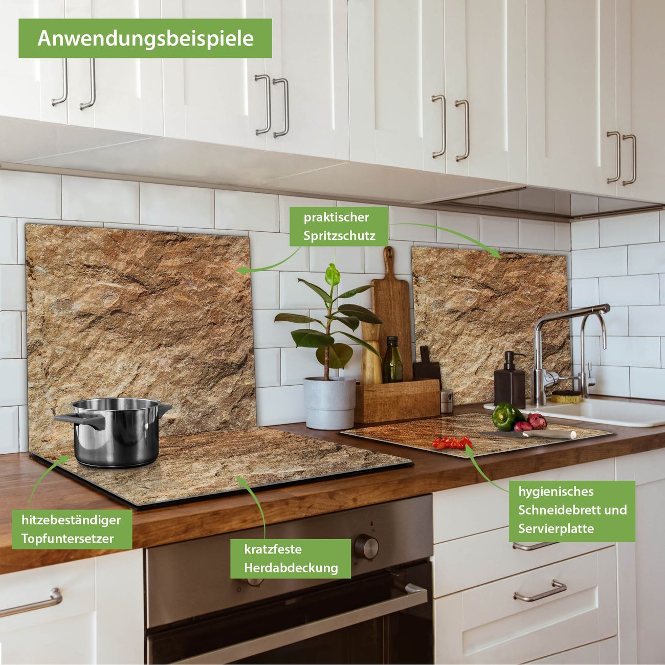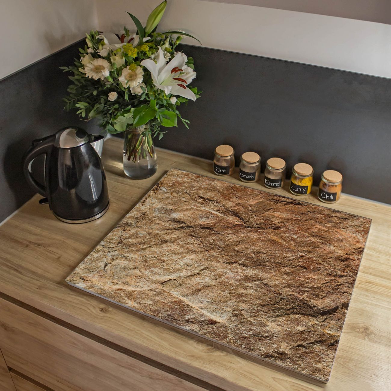 VIELSEITIG: Die Ceranfeldabdeckung ist vielseitig einsetzbar: ob als Spritzschutz hinter dem Herd für Ihre Küche oder als Glas Schneidebrett als hygienische und geruchsneutrale Unterlage. Sie können ebenfalls heiße Töpfe und Pfannen bis 100°C auf der Herdplattenabdeckung abstellen. Sie erhalten ein Multitalent für Ihre Küche. Die banjado Herdabdeckplatte aus Glas mit Motiv Steinstruktur verdeckt mit einem schönen Motiv Ihr Ceranfeld bzw. Ihren Induktionsherd. Die Herdabdeckplatte ist vielseitig einsetzbar und passt sich dabei Ihrem Einrichtungsstil an. DESIGN: Die Herdabdeckung Steinstruktur besteht aus hochwertigem, gehärtetem Glas mit einem unserer zahlreichen Motive. Sie haben die Wahl zwischen verschiedenen Maßen von einteiligen, zweiteiligen und einer dreiteiligen Herdabdeckung. Wählen Sie was zu Ihrer Einrichtung passt! DETAILS: Die Herdabdeckplatte ist vielseitig einsetzbar. Die Ecken sind für mehr Sicherheit dezent abgerundet, das Glas ist gehärtet. Sie erhalten separate Gummi Abstandshalter, damit Ihre Abdeckung rutschfest auf dem Herd steht. Diese können Sie frei positionieren, sodass die Herdabdeckung perfekt auf Ihrem Ceranfeld sitzt. BANJADO: Wir sind ein kleines Team aus dem Herzen von Sachsen und fertigen jeden Artikel nach Bestellung eigens für Sie an. Sie erhalten also keine preiswerte Importware, sondern Handarbeit. Auf Wunsch sind auch andere Farben und Größen möglich, kontakierten Sie uns gern.