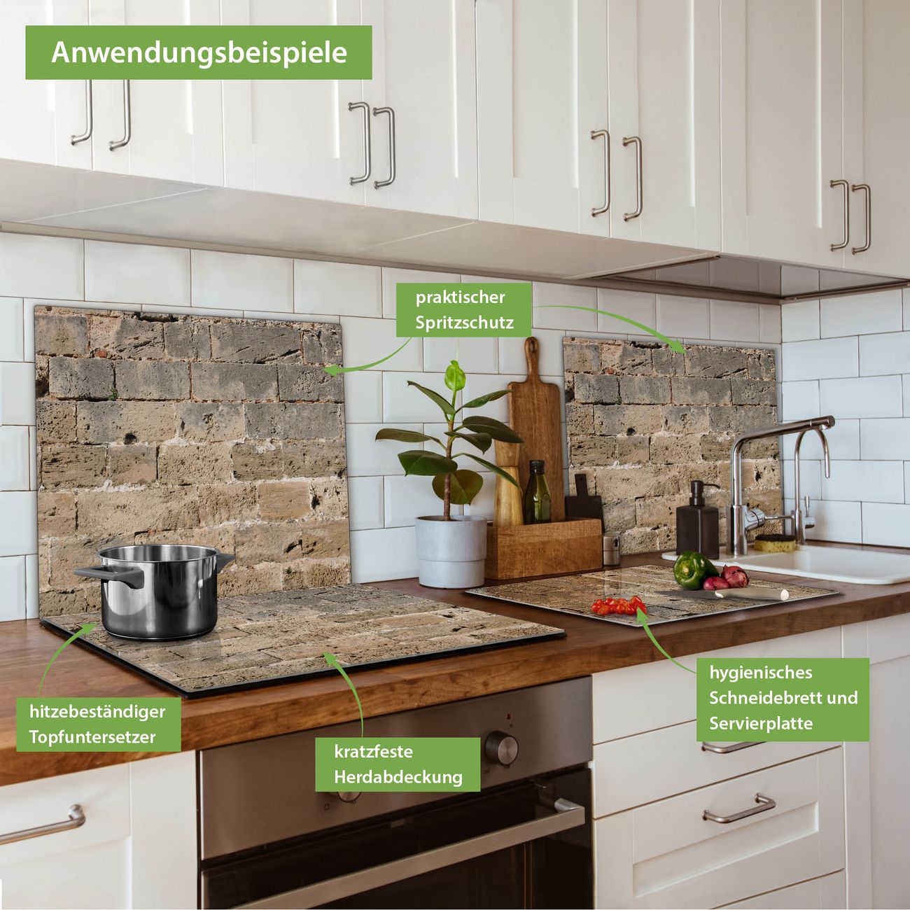 VIELSEITIG: Die Ceranfeldabdeckung ist vielseitig einsetzbar: ob als Spritzschutz hinter dem Herd für Ihre Küche oder als Glas Schneidebrett als hygienische und geruchsneutrale Unterlage. Sie können ebenfalls heiße Töpfe und Pfannen bis 100°C auf der Herdplattenabdeckung abstellen. Sie erhalten ein Multitalent für Ihre Küche. Die banjado Herdabdeckplatte aus Glas mit Motiv Steinwand Antik verdeckt mit einem schönen Motiv Ihr Ceranfeld bzw. Ihren Induktionsherd. Die Herdabdeckplatte ist vielseitig einsetzbar und passt sich dabei Ihrem Einrichtungsstil an. DESIGN: Die Herdabdeckung Steinwand Antik besteht aus hochwertigem, gehärtetem Glas mit einem unserer zahlreichen Motive. Sie haben die Wahl zwischen verschiedenen Maßen von einteiligen, zweiteiligen und einer dreiteiligen Herdabdeckung. Wählen Sie was zu Ihrer Einrichtung passt! DETAILS: Die Herdabdeckplatte ist vielseitig einsetzbar. Die Ecken sind für mehr Sicherheit dezent abgerundet, das Glas ist gehärtet. Sie erhalten separate Gummi Abstandshalter, damit Ihre Abdeckung rutschfest auf dem Herd steht. Diese können Sie frei positionieren, sodass die Herdabdeckung perfekt auf Ihrem Ceranfeld sitzt. BANJADO: Wir sind ein kleines Team aus dem Herzen von Sachsen und fertigen jeden Artikel nach Bestellung eigens für Sie an. Sie erhalten also keine preiswerte Importware, sondern Handarbeit. Auf Wunsch sind auch andere Farben und Größen möglich, kontakierten Sie uns gern.