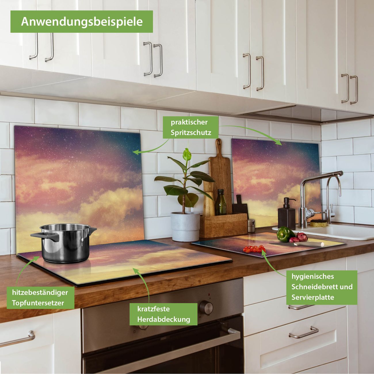 VIELSEITIG: Die Ceranfeldabdeckung ist vielseitig einsetzbar: ob als Spritzschutz hinter dem Herd für Ihre Küche oder als Glas Schneidebrett als hygienische und geruchsneutrale Unterlage. Sie können ebenfalls heiße Töpfe und Pfannen bis 100°C auf der Herdplattenabdeckung abstellen. Sie erhalten ein Multitalent für Ihre Küche. Die banjado Herdabdeckplatte aus Glas mit Motiv Sternenhimmel verdeckt mit einem schönen Motiv Ihr Ceranfeld bzw. Ihren Induktionsherd. Die Herdabdeckplatte ist vielseitig einsetzbar und passt sich dabei Ihrem Einrichtungsstil an. DESIGN: Die Herdabdeckung Sternenhimmel besteht aus hochwertigem, gehärtetem Glas mit einem unserer zahlreichen Motive. Sie haben die Wahl zwischen verschiedenen Maßen von einteiligen, zweiteiligen und einer dreiteiligen Herdabdeckung. Wählen Sie was zu Ihrer Einrichtung passt! DETAILS: Die Herdabdeckplatte ist vielseitig einsetzbar. Die Ecken sind für mehr Sicherheit dezent abgerundet, das Glas ist gehärtet. Sie erhalten separate Gummi Abstandshalter, damit Ihre Abdeckung rutschfest auf dem Herd steht. Diese können Sie frei positionieren, sodass die Herdabdeckung perfekt auf Ihrem Ceranfeld sitzt. BANJADO: Wir sind ein kleines Team aus dem Herzen von Sachsen und fertigen jeden Artikel nach Bestellung eigens für Sie an. Sie erhalten also keine preiswerte Importware, sondern Handarbeit. Auf Wunsch sind auch andere Farben und Größen möglich, kontakierten Sie uns gern.