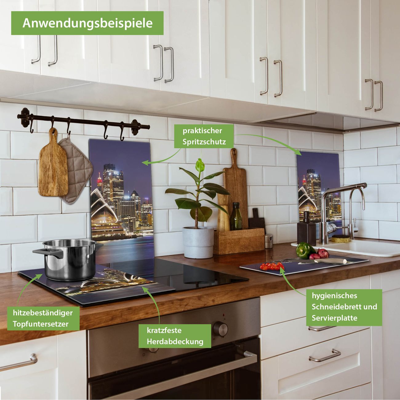 VIELSEITIG: Die Ceranfeldabdeckung ist vielseitig einsetzbar: ob als Spritzschutz hinter dem Herd für Ihre Küche oder als Glas Schneidebrett als hygienische und geruchsneutrale Unterlage. Sie können ebenfalls heiße Töpfe und Pfannen bis 100°C auf der Herdplattenabdeckung abstellen. Sie erhalten ein Multitalent für Ihre Küche. Die banjado Herdabdeckplatte aus Glas mit Motiv Sydney verdeckt mit einem schönen Motiv Ihr Ceranfeld bzw. Ihren Induktionsherd. Die Herdabdeckplatte ist vielseitig einsetzbar und passt sich dabei Ihrem Einrichtungsstil an. DESIGN: Die Herdabdeckung Sydney besteht aus hochwertigem, gehärtetem Glas mit einem unserer zahlreichen Motive. Sie haben die Wahl zwischen verschiedenen Maßen von einteiligen, zweiteiligen und einer dreiteiligen Herdabdeckung. Wählen Sie was zu Ihrer Einrichtung passt! DETAILS: Die Herdabdeckplatte ist vielseitig einsetzbar. Die Ecken sind für mehr Sicherheit dezent abgerundet, das Glas ist gehärtet. Sie erhalten separate Gummi Abstandshalter, damit Ihre Abdeckung rutschfest auf dem Herd steht. Diese können Sie frei positionieren, sodass die Herdabdeckung perfekt auf Ihrem Ceranfeld sitzt. BANJADO: Wir sind ein kleines Team aus dem Herzen von Sachsen und fertigen jeden Artikel nach Bestellung eigens für Sie an. Sie erhalten also keine preiswerte Importware, sondern Handarbeit. Auf Wunsch sind auch andere Farben und Größen möglich, kontakierten Sie uns gern.