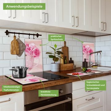 VIELSEITIG: Die Ceranfeldabdeckung ist vielseitig einsetzbar: ob als Spritzschutz hinter dem Herd für Ihre Küche oder als Glas Schneidebrett als hygienische und geruchsneutrale Unterlage. Sie können ebenfalls heiße Töpfe und Pfannen bis 100°C auf der Herdplattenabdeckung abstellen. Sie erhalten ein Multitalent für Ihre Küche. Die banjado Herdabdeckplatte aus Glas mit Motiv Tasse Voll Rosen verdeckt mit einem schönen Motiv Ihr Ceranfeld bzw. Ihren Induktionsherd. Die Herdabdeckplatte ist vielseitig einsetzbar und passt sich dabei Ihrem Einrichtungsstil an. DESIGN: Die Herdabdeckung Tasse Voll Rosen besteht aus hochwertigem, gehärtetem Glas mit einem unserer zahlreichen Motive. Sie haben die Wahl zwischen verschiedenen Maßen von einteiligen, zweiteiligen und einer dreiteiligen Herdabdeckung. Wählen Sie was zu Ihrer Einrichtung passt! DETAILS: Die Herdabdeckplatte ist vielseitig einsetzbar. Die Ecken sind für mehr Sicherheit dezent abgerundet, das Glas ist gehärtet. Sie erhalten separate Gummi Abstandshalter, damit Ihre Abdeckung rutschfest auf dem Herd steht. Diese können Sie frei positionieren, sodass die Herdabdeckung perfekt auf Ihrem Ceranfeld sitzt. BANJADO: Wir sind ein kleines Team aus dem Herzen von Sachsen und fertigen jeden Artikel nach Bestellung eigens für Sie an. Sie erhalten also keine preiswerte Importware, sondern Handarbeit. Auf Wunsch sind auch andere Farben und Größen möglich, kontakierten Sie uns gern.