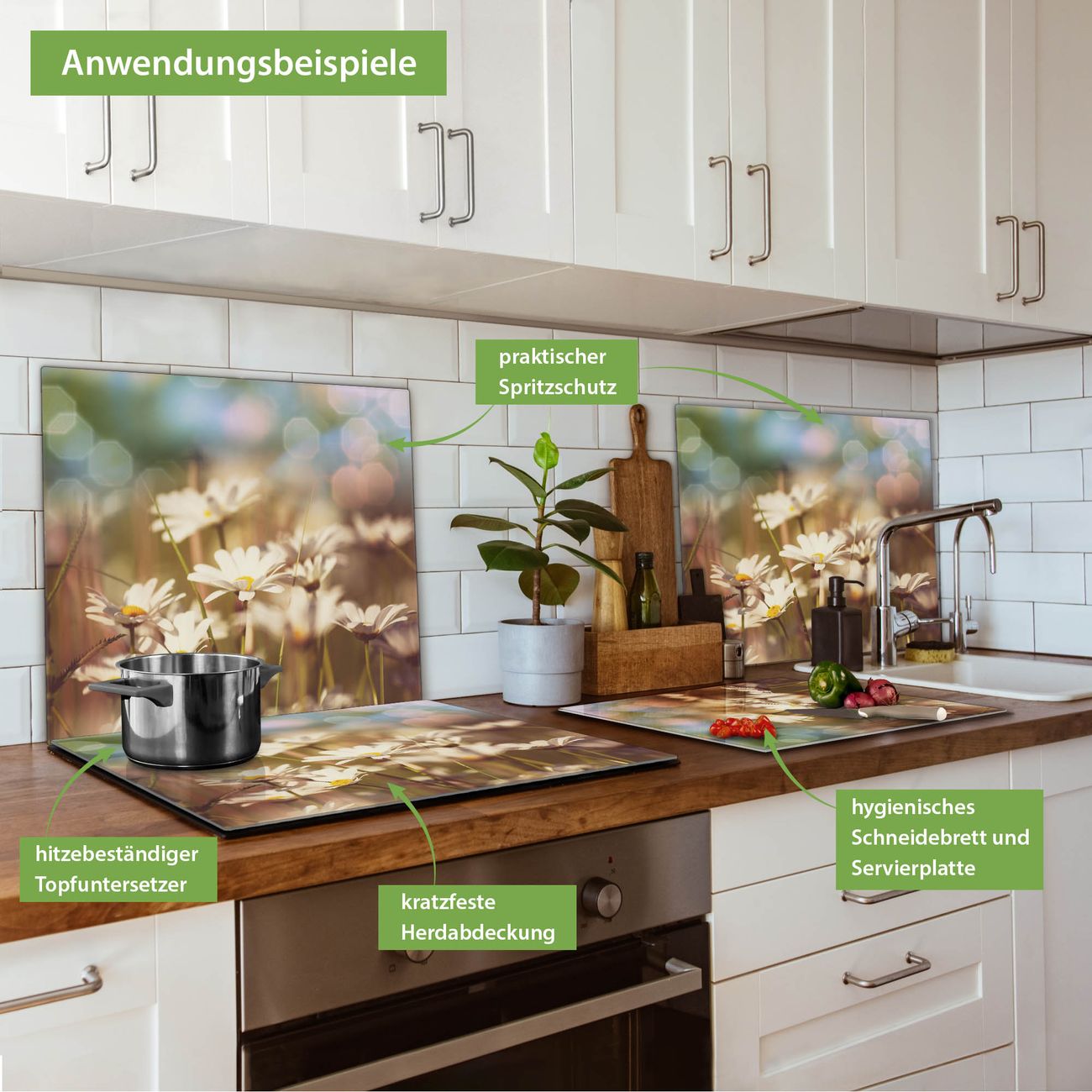 VIELSEITIG: Die Ceranfeldabdeckung ist vielseitig einsetzbar: ob als Spritzschutz hinter dem Herd für Ihre Küche oder als Glas Schneidebrett als hygienische und geruchsneutrale Unterlage. Sie können ebenfalls heiße Töpfe und Pfannen bis 100°C auf der Herdplattenabdeckung abstellen. Sie erhalten ein Multitalent für Ihre Küche. Die banjado Herdabdeckplatte aus Glas mit Motiv Tausendschönwiese verdeckt mit einem schönen Motiv Ihr Ceranfeld bzw. Ihren Induktionsherd. Die Herdabdeckplatte ist vielseitig einsetzbar und passt sich dabei Ihrem Einrichtungsstil an. DESIGN: Die Herdabdeckung Tausendschönwiese besteht aus hochwertigem, gehärtetem Glas mit einem unserer zahlreichen Motive. Sie haben die Wahl zwischen verschiedenen Maßen von einteiligen, zweiteiligen und einer dreiteiligen Herdabdeckung. Wählen Sie was zu Ihrer Einrichtung passt! DETAILS: Die Herdabdeckplatte ist vielseitig einsetzbar. Die Ecken sind für mehr Sicherheit dezent abgerundet, das Glas ist gehärtet. Sie erhalten separate Gummi Abstandshalter, damit Ihre Abdeckung rutschfest auf dem Herd steht. Diese können Sie frei positionieren, sodass die Herdabdeckung perfekt auf Ihrem Ceranfeld sitzt. BANJADO: Wir sind ein kleines Team aus dem Herzen von Sachsen und fertigen jeden Artikel nach Bestellung eigens für Sie an. Sie erhalten also keine preiswerte Importware, sondern Handarbeit. Auf Wunsch sind auch andere Farben und Größen möglich, kontakierten Sie uns gern.