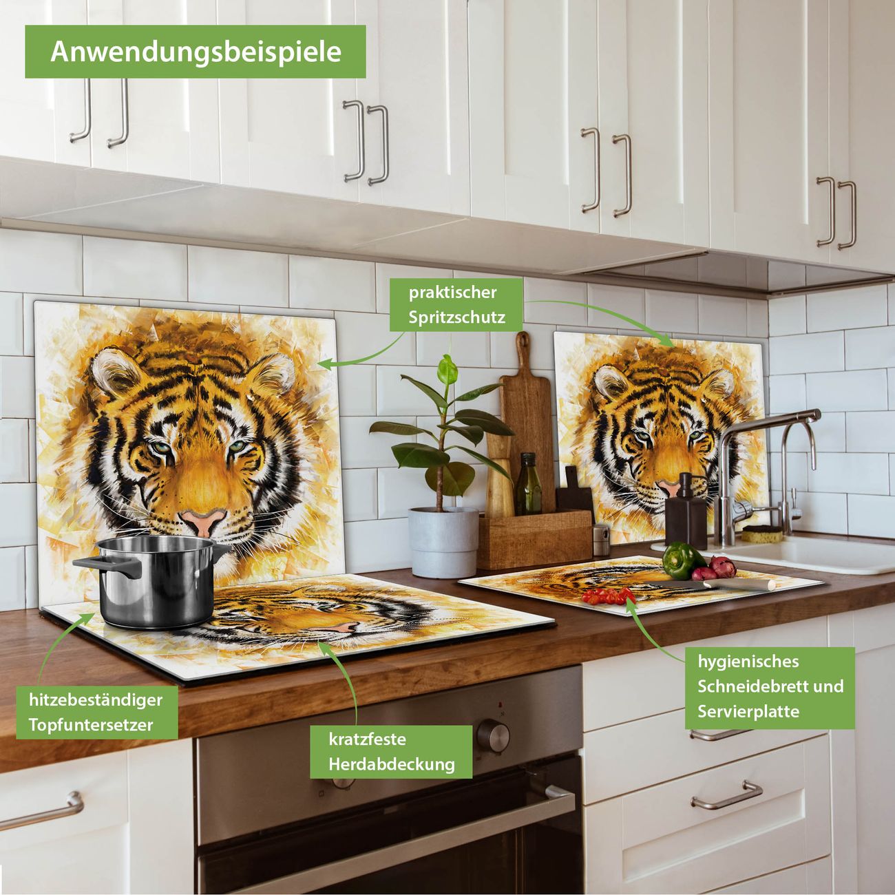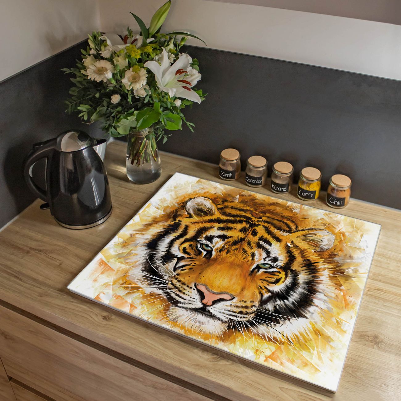 VIELSEITIG: Die Ceranfeldabdeckung ist vielseitig einsetzbar: ob als Spritzschutz hinter dem Herd für Ihre Küche oder als Glas Schneidebrett als hygienische und geruchsneutrale Unterlage. Sie können ebenfalls heiße Töpfe und Pfannen bis 100°C auf der Herdplattenabdeckung abstellen. Sie erhalten ein Multitalent für Ihre Küche. Die banjado Herdabdeckplatte aus Glas mit Motiv Tigerkopf verdeckt mit einem schönen Motiv Ihr Ceranfeld bzw. Ihren Induktionsherd. Die Herdabdeckplatte ist vielseitig einsetzbar und passt sich dabei Ihrem Einrichtungsstil an. DESIGN: Die Herdabdeckung Tigerkopf besteht aus hochwertigem, gehärtetem Glas mit einem unserer zahlreichen Motive. Sie haben die Wahl zwischen verschiedenen Maßen von einteiligen, zweiteiligen und einer dreiteiligen Herdabdeckung. Wählen Sie was zu Ihrer Einrichtung passt! DETAILS: Die Herdabdeckplatte ist vielseitig einsetzbar. Die Ecken sind für mehr Sicherheit dezent abgerundet, das Glas ist gehärtet. Sie erhalten separate Gummi Abstandshalter, damit Ihre Abdeckung rutschfest auf dem Herd steht. Diese können Sie frei positionieren, sodass die Herdabdeckung perfekt auf Ihrem Ceranfeld sitzt. BANJADO: Wir sind ein kleines Team aus dem Herzen von Sachsen und fertigen jeden Artikel nach Bestellung eigens für Sie an. Sie erhalten also keine preiswerte Importware, sondern Handarbeit. Auf Wunsch sind auch andere Farben und Größen möglich, kontakierten Sie uns gern.