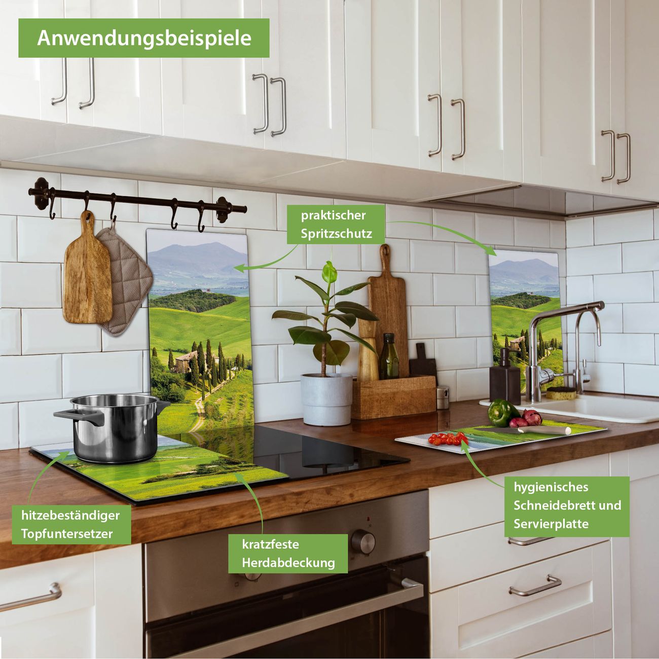 VIELSEITIG: Die Ceranfeldabdeckung ist vielseitig einsetzbar: ob als Spritzschutz hinter dem Herd für Ihre Küche oder als Glas Schneidebrett als hygienische und geruchsneutrale Unterlage. Sie können ebenfalls heiße Töpfe und Pfannen bis 100°C auf der Herdplattenabdeckung abstellen. Sie erhalten ein Multitalent für Ihre Küche. Die banjado Herdabdeckplatte aus Glas mit Motiv Toskana verdeckt mit einem schönen Motiv Ihr Ceranfeld bzw. Ihren Induktionsherd. Die Herdabdeckplatte ist vielseitig einsetzbar und passt sich dabei Ihrem Einrichtungsstil an. DESIGN: Die Herdabdeckung Toskana besteht aus hochwertigem, gehärtetem Glas mit einem unserer zahlreichen Motive. Sie haben die Wahl zwischen verschiedenen Maßen von einteiligen, zweiteiligen und einer dreiteiligen Herdabdeckung. Wählen Sie was zu Ihrer Einrichtung passt! DETAILS: Die Herdabdeckplatte ist vielseitig einsetzbar. Die Ecken sind für mehr Sicherheit dezent abgerundet, das Glas ist gehärtet. Sie erhalten separate Gummi Abstandshalter, damit Ihre Abdeckung rutschfest auf dem Herd steht. Diese können Sie frei positionieren, sodass die Herdabdeckung perfekt auf Ihrem Ceranfeld sitzt. BANJADO: Wir sind ein kleines Team aus dem Herzen von Sachsen und fertigen jeden Artikel nach Bestellung eigens für Sie an. Sie erhalten also keine preiswerte Importware, sondern Handarbeit. Auf Wunsch sind auch andere Farben und Größen möglich, kontakierten Sie uns gern.