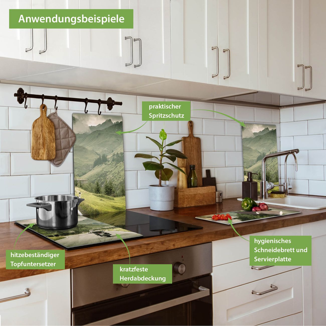 VIELSEITIG: Die Ceranfeldabdeckung ist vielseitig einsetzbar: ob als Spritzschutz hinter dem Herd für Ihre Küche oder als Glas Schneidebrett als hygienische und geruchsneutrale Unterlage. Sie können ebenfalls heiße Töpfe und Pfannen bis 100°C auf der Herdplattenabdeckung abstellen. Sie erhalten ein Multitalent für Ihre Küche. Die banjado Herdabdeckplatte aus Glas mit Motiv Transalp verdeckt mit einem schönen Motiv Ihr Ceranfeld bzw. Ihren Induktionsherd. Die Herdabdeckplatte ist vielseitig einsetzbar und passt sich dabei Ihrem Einrichtungsstil an. DESIGN: Die Herdabdeckung Transalp besteht aus hochwertigem, gehärtetem Glas mit einem unserer zahlreichen Motive. Sie haben die Wahl zwischen verschiedenen Maßen von einteiligen, zweiteiligen und einer dreiteiligen Herdabdeckung. Wählen Sie was zu Ihrer Einrichtung passt! DETAILS: Die Herdabdeckplatte ist vielseitig einsetzbar. Die Ecken sind für mehr Sicherheit dezent abgerundet, das Glas ist gehärtet. Sie erhalten separate Gummi Abstandshalter, damit Ihre Abdeckung rutschfest auf dem Herd steht. Diese können Sie frei positionieren, sodass die Herdabdeckung perfekt auf Ihrem Ceranfeld sitzt. BANJADO: Wir sind ein kleines Team aus dem Herzen von Sachsen und fertigen jeden Artikel nach Bestellung eigens für Sie an. Sie erhalten also keine preiswerte Importware, sondern Handarbeit. Auf Wunsch sind auch andere Farben und Größen möglich, kontakierten Sie uns gern.