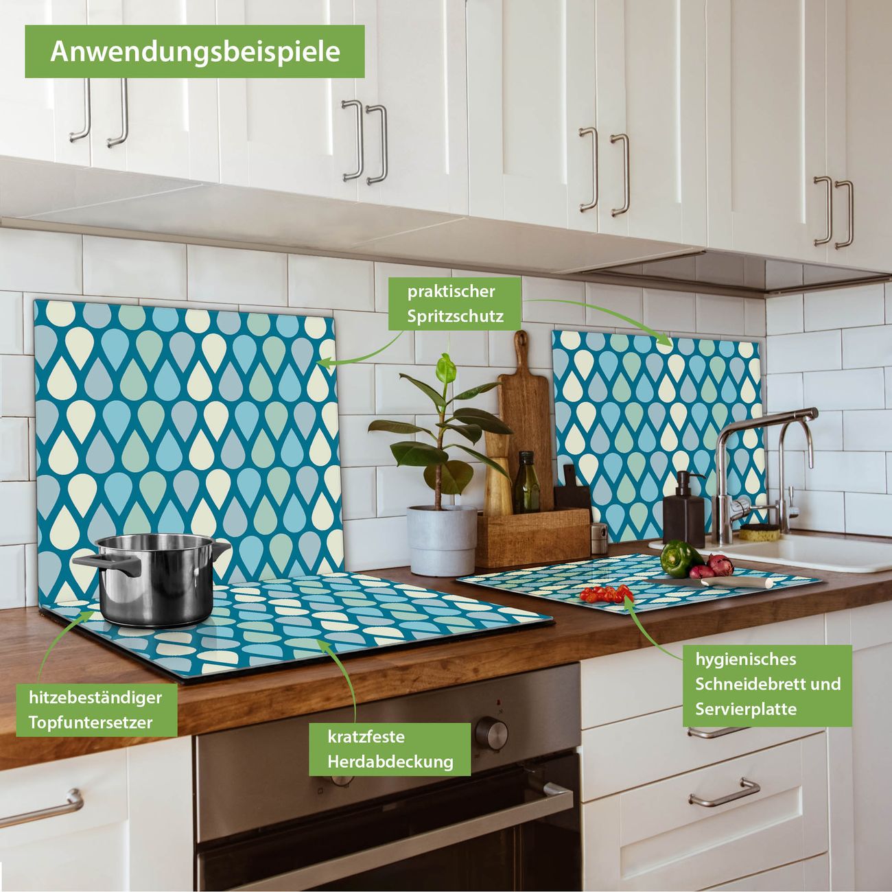 VIELSEITIG: Die Ceranfeldabdeckung ist vielseitig einsetzbar: ob als Spritzschutz hinter dem Herd für Ihre Küche oder als Glas Schneidebrett als hygienische und geruchsneutrale Unterlage. Sie können ebenfalls heiße Töpfe und Pfannen bis 100°C auf der Herdplattenabdeckung abstellen. Sie erhalten ein Multitalent für Ihre Küche. Die banjado Herdabdeckplatte aus Glas mit Motiv Tropfen verdeckt mit einem schönen Motiv Ihr Ceranfeld bzw. Ihren Induktionsherd. Die Herdabdeckplatte ist vielseitig einsetzbar und passt sich dabei Ihrem Einrichtungsstil an. DESIGN: Die Herdabdeckung Tropfen besteht aus hochwertigem, gehärtetem Glas mit einem unserer zahlreichen Motive. Sie haben die Wahl zwischen verschiedenen Maßen von einteiligen, zweiteiligen und einer dreiteiligen Herdabdeckung. Wählen Sie was zu Ihrer Einrichtung passt! DETAILS: Die Herdabdeckplatte ist vielseitig einsetzbar. Die Ecken sind für mehr Sicherheit dezent abgerundet, das Glas ist gehärtet. Sie erhalten separate Gummi Abstandshalter, damit Ihre Abdeckung rutschfest auf dem Herd steht. Diese können Sie frei positionieren, sodass die Herdabdeckung perfekt auf Ihrem Ceranfeld sitzt. BANJADO: Wir sind ein kleines Team aus dem Herzen von Sachsen und fertigen jeden Artikel nach Bestellung eigens für Sie an. Sie erhalten also keine preiswerte Importware, sondern Handarbeit. Auf Wunsch sind auch andere Farben und Größen möglich, kontakierten Sie uns gern.