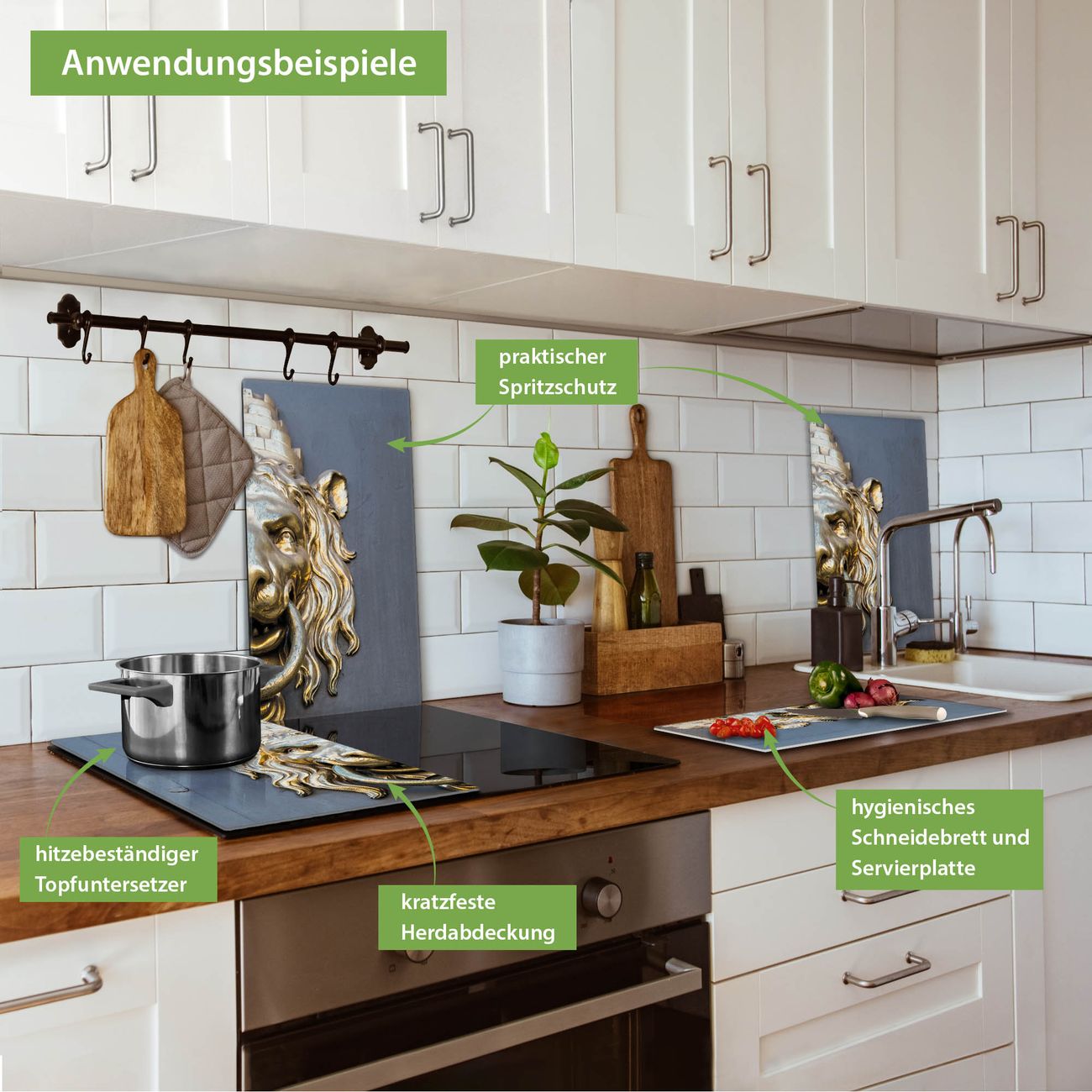 VIELSEITIG: Die Ceranfeldabdeckung ist vielseitig einsetzbar: ob als Spritzschutz hinter dem Herd für Ihre Küche oder als Glas Schneidebrett als hygienische und geruchsneutrale Unterlage. Sie können ebenfalls heiße Töpfe und Pfannen bis 100°C auf der Herdplattenabdeckung abstellen. Sie erhalten ein Multitalent für Ihre Küche. Die banjado Herdabdeckplatte aus Glas mit Motiv Türklopfer Löwe verdeckt mit einem schönen Motiv Ihr Ceranfeld bzw. Ihren Induktionsherd. Die Herdabdeckplatte ist vielseitig einsetzbar und passt sich dabei Ihrem Einrichtungsstil an. DESIGN: Die Herdabdeckung Türklopfer Löwe besteht aus hochwertigem, gehärtetem Glas mit einem unserer zahlreichen Motive. Sie haben die Wahl zwischen verschiedenen Maßen von einteiligen, zweiteiligen und einer dreiteiligen Herdabdeckung. Wählen Sie was zu Ihrer Einrichtung passt! DETAILS: Die Herdabdeckplatte ist vielseitig einsetzbar. Die Ecken sind für mehr Sicherheit dezent abgerundet, das Glas ist gehärtet. Sie erhalten separate Gummi Abstandshalter, damit Ihre Abdeckung rutschfest auf dem Herd steht. Diese können Sie frei positionieren, sodass die Herdabdeckung perfekt auf Ihrem Ceranfeld sitzt. BANJADO: Wir sind ein kleines Team aus dem Herzen von Sachsen und fertigen jeden Artikel nach Bestellung eigens für Sie an. Sie erhalten also keine preiswerte Importware, sondern Handarbeit. Auf Wunsch sind auch andere Farben und Größen möglich, kontakierten Sie uns gern.