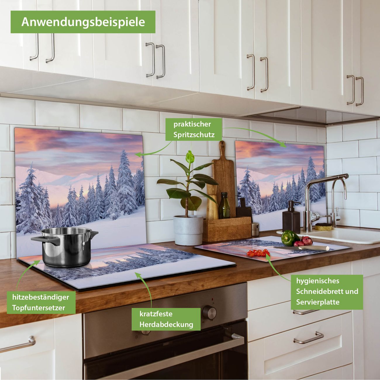 VIELSEITIG: Die Ceranfeldabdeckung ist vielseitig einsetzbar: ob als Spritzschutz hinter dem Herd für Ihre Küche oder als Glas Schneidebrett als hygienische und geruchsneutrale Unterlage. Sie können ebenfalls heiße Töpfe und Pfannen bis 100°C auf der Herdplattenabdeckung abstellen. Sie erhalten ein Multitalent für Ihre Küche. Die banjado Herdabdeckplatte aus Glas mit Motiv Verschneite Berge verdeckt mit einem schönen Motiv Ihr Ceranfeld bzw. Ihren Induktionsherd. Die Herdabdeckplatte ist vielseitig einsetzbar und passt sich dabei Ihrem Einrichtungsstil an. DESIGN: Die Herdabdeckung Verschneite Berge besteht aus hochwertigem, gehärtetem Glas mit einem unserer zahlreichen Motive. Sie haben die Wahl zwischen verschiedenen Maßen von einteiligen, zweiteiligen und einer dreiteiligen Herdabdeckung. Wählen Sie was zu Ihrer Einrichtung passt! DETAILS: Die Herdabdeckplatte ist vielseitig einsetzbar. Die Ecken sind für mehr Sicherheit dezent abgerundet, das Glas ist gehärtet. Sie erhalten separate Gummi Abstandshalter, damit Ihre Abdeckung rutschfest auf dem Herd steht. Diese können Sie frei positionieren, sodass die Herdabdeckung perfekt auf Ihrem Ceranfeld sitzt. BANJADO: Wir sind ein kleines Team aus dem Herzen von Sachsen und fertigen jeden Artikel nach Bestellung eigens für Sie an. Sie erhalten also keine preiswerte Importware, sondern Handarbeit. Auf Wunsch sind auch andere Farben und Größen möglich, kontakierten Sie uns gern.