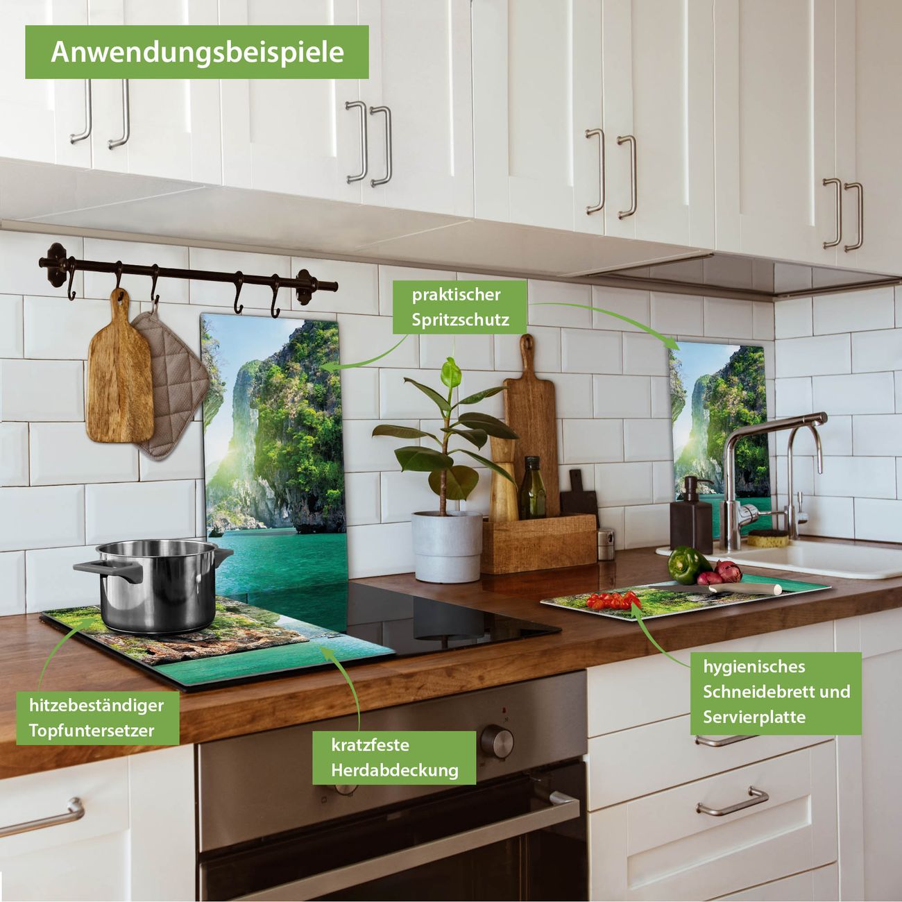 VIELSEITIG: Die Ceranfeldabdeckung ist vielseitig einsetzbar: ob als Spritzschutz hinter dem Herd für Ihre Küche oder als Glas Schneidebrett als hygienische und geruchsneutrale Unterlage. Sie können ebenfalls heiße Töpfe und Pfannen bis 100°C auf der Herdplattenabdeckung abstellen. Sie erhalten ein Multitalent für Ihre Küche. Die banjado Herdabdeckplatte aus Glas mit Motiv Versteckte Bucht verdeckt mit einem schönen Motiv Ihr Ceranfeld bzw. Ihren Induktionsherd. Die Herdabdeckplatte ist vielseitig einsetzbar und passt sich dabei Ihrem Einrichtungsstil an. DESIGN: Die Herdabdeckung Versteckte Bucht besteht aus hochwertigem, gehärtetem Glas mit einem unserer zahlreichen Motive. Sie haben die Wahl zwischen verschiedenen Maßen von einteiligen, zweiteiligen und einer dreiteiligen Herdabdeckung. Wählen Sie was zu Ihrer Einrichtung passt! DETAILS: Die Herdabdeckplatte ist vielseitig einsetzbar. Die Ecken sind für mehr Sicherheit dezent abgerundet, das Glas ist gehärtet. Sie erhalten separate Gummi Abstandshalter, damit Ihre Abdeckung rutschfest auf dem Herd steht. Diese können Sie frei positionieren, sodass die Herdabdeckung perfekt auf Ihrem Ceranfeld sitzt. BANJADO: Wir sind ein kleines Team aus dem Herzen von Sachsen und fertigen jeden Artikel nach Bestellung eigens für Sie an. Sie erhalten also keine preiswerte Importware, sondern Handarbeit. Auf Wunsch sind auch andere Farben und Größen möglich, kontakierten Sie uns gern.