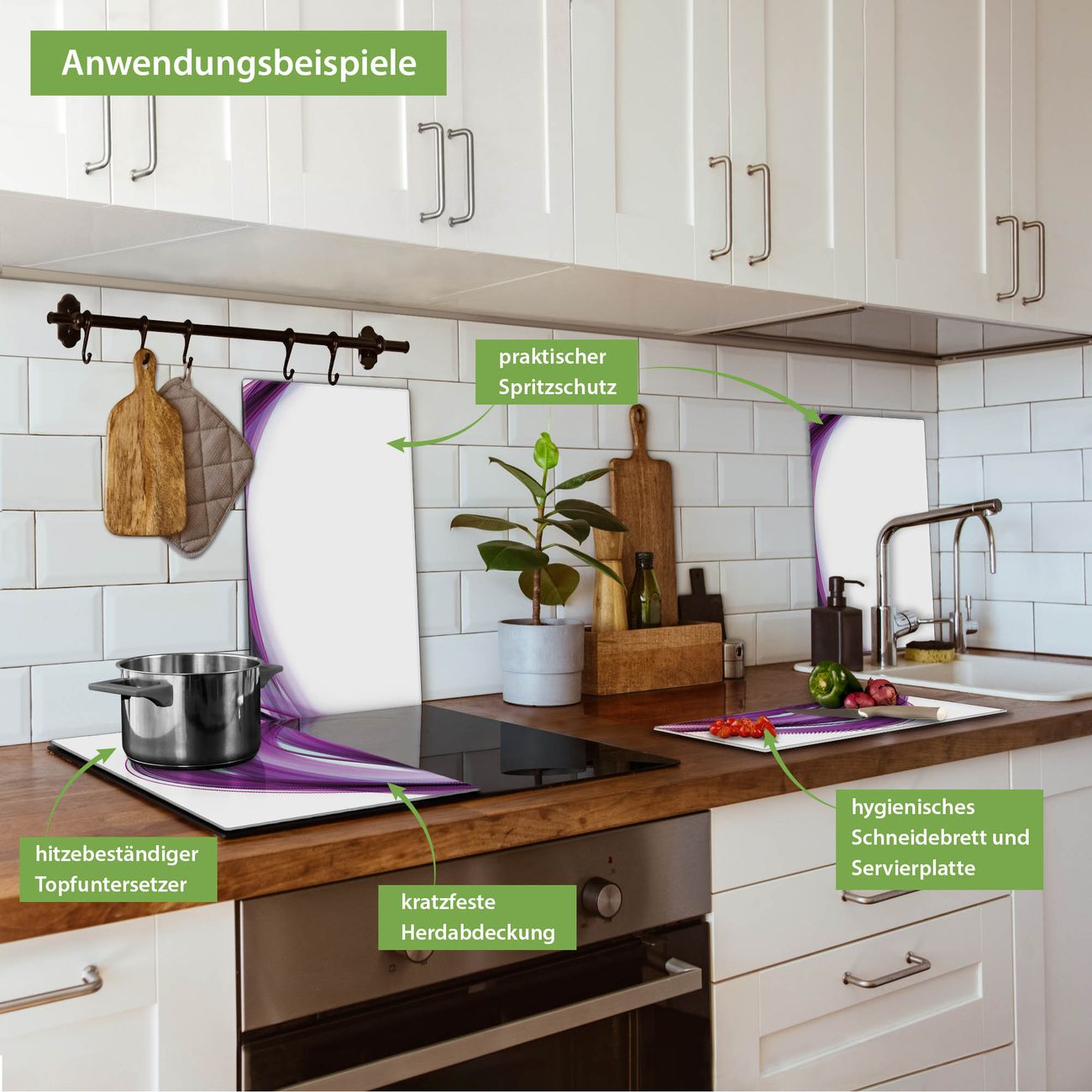 VIELSEITIG: Die Ceranfeldabdeckung ist vielseitig einsetzbar: ob als Spritzschutz hinter dem Herd für Ihre Küche oder als Glas Schneidebrett als hygienische und geruchsneutrale Unterlage. Sie können ebenfalls heiße Töpfe und Pfannen bis 100°C auf der Herdplattenabdeckung abstellen. Sie erhalten ein Multitalent für Ihre Küche. Die banjado Herdabdeckplatte aus Glas mit Motiv Violet Element verdeckt mit einem schönen Motiv Ihr Ceranfeld bzw. Ihren Induktionsherd. Die Herdabdeckplatte ist vielseitig einsetzbar und passt sich dabei Ihrem Einrichtungsstil an. DESIGN: Die Herdabdeckung Violet Element besteht aus hochwertigem, gehärtetem Glas mit einem unserer zahlreichen Motive. Sie haben die Wahl zwischen verschiedenen Maßen von einteiligen, zweiteiligen und einer dreiteiligen Herdabdeckung. Wählen Sie was zu Ihrer Einrichtung passt! DETAILS: Die Herdabdeckplatte ist vielseitig einsetzbar. Die Ecken sind für mehr Sicherheit dezent abgerundet, das Glas ist gehärtet. Sie erhalten separate Gummi Abstandshalter, damit Ihre Abdeckung rutschfest auf dem Herd steht. Diese können Sie frei positionieren, sodass die Herdabdeckung perfekt auf Ihrem Ceranfeld sitzt. BANJADO: Wir sind ein kleines Team aus dem Herzen von Sachsen und fertigen jeden Artikel nach Bestellung eigens für Sie an. Sie erhalten also keine preiswerte Importware, sondern Handarbeit. Auf Wunsch sind auch andere Farben und Größen möglich, kontakierten Sie uns gern.