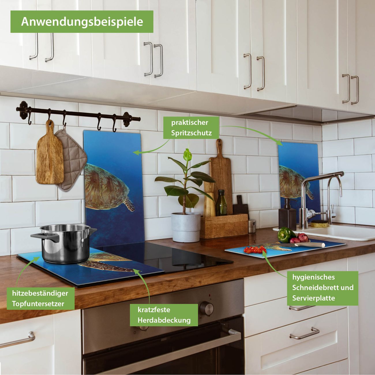 VIELSEITIG: Die Ceranfeldabdeckung ist vielseitig einsetzbar: ob als Spritzschutz hinter dem Herd für Ihre Küche oder als Glas Schneidebrett als hygienische und geruchsneutrale Unterlage. Sie können ebenfalls heiße Töpfe und Pfannen bis 100°C auf der Herdplattenabdeckung abstellen. Sie erhalten ein Multitalent für Ihre Küche. Die banjado Herdabdeckplatte aus Glas mit Motiv Wasserschildkröte verdeckt mit einem schönen Motiv Ihr Ceranfeld bzw. Ihren Induktionsherd. Die Herdabdeckplatte ist vielseitig einsetzbar und passt sich dabei Ihrem Einrichtungsstil an. DESIGN: Die Herdabdeckung Wasserschildkröte besteht aus hochwertigem, gehärtetem Glas mit einem unserer zahlreichen Motive. Sie haben die Wahl zwischen verschiedenen Maßen von einteiligen, zweiteiligen und einer dreiteiligen Herdabdeckung. Wählen Sie was zu Ihrer Einrichtung passt! DETAILS: Die Herdabdeckplatte ist vielseitig einsetzbar. Die Ecken sind für mehr Sicherheit dezent abgerundet, das Glas ist gehärtet. Sie erhalten separate Gummi Abstandshalter, damit Ihre Abdeckung rutschfest auf dem Herd steht. Diese können Sie frei positionieren, sodass die Herdabdeckung perfekt auf Ihrem Ceranfeld sitzt. BANJADO: Wir sind ein kleines Team aus dem Herzen von Sachsen und fertigen jeden Artikel nach Bestellung eigens für Sie an. Sie erhalten also keine preiswerte Importware, sondern Handarbeit. Auf Wunsch sind auch andere Farben und Größen möglich, kontakierten Sie uns gern.