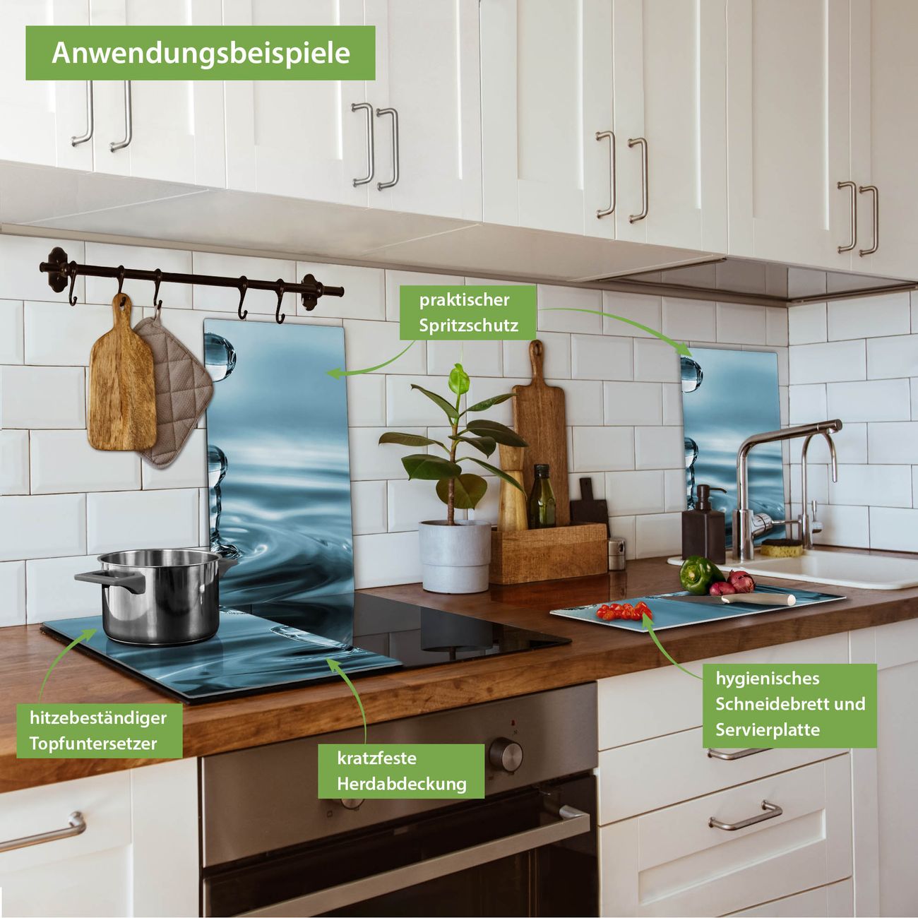 VIELSEITIG: Die Ceranfeldabdeckung ist vielseitig einsetzbar: ob als Spritzschutz hinter dem Herd für Ihre Küche oder als Glas Schneidebrett als hygienische und geruchsneutrale Unterlage. Sie können ebenfalls heiße Töpfe und Pfannen bis 100°C auf der Herdplattenabdeckung abstellen. Sie erhalten ein Multitalent für Ihre Küche. Die banjado Herdabdeckplatte aus Glas mit Motiv Wassertropfen verdeckt mit einem schönen Motiv Ihr Ceranfeld bzw. Ihren Induktionsherd. Die Herdabdeckplatte ist vielseitig einsetzbar und passt sich dabei Ihrem Einrichtungsstil an. DESIGN: Die Herdabdeckung Wassertropfen besteht aus hochwertigem, gehärtetem Glas mit einem unserer zahlreichen Motive. Sie haben die Wahl zwischen verschiedenen Maßen von einteiligen, zweiteiligen und einer dreiteiligen Herdabdeckung. Wählen Sie was zu Ihrer Einrichtung passt! DETAILS: Die Herdabdeckplatte ist vielseitig einsetzbar. Die Ecken sind für mehr Sicherheit dezent abgerundet, das Glas ist gehärtet. Sie erhalten separate Gummi Abstandshalter, damit Ihre Abdeckung rutschfest auf dem Herd steht. Diese können Sie frei positionieren, sodass die Herdabdeckung perfekt auf Ihrem Ceranfeld sitzt. BANJADO: Wir sind ein kleines Team aus dem Herzen von Sachsen und fertigen jeden Artikel nach Bestellung eigens für Sie an. Sie erhalten also keine preiswerte Importware, sondern Handarbeit. Auf Wunsch sind auch andere Farben und Größen möglich, kontakierten Sie uns gern.