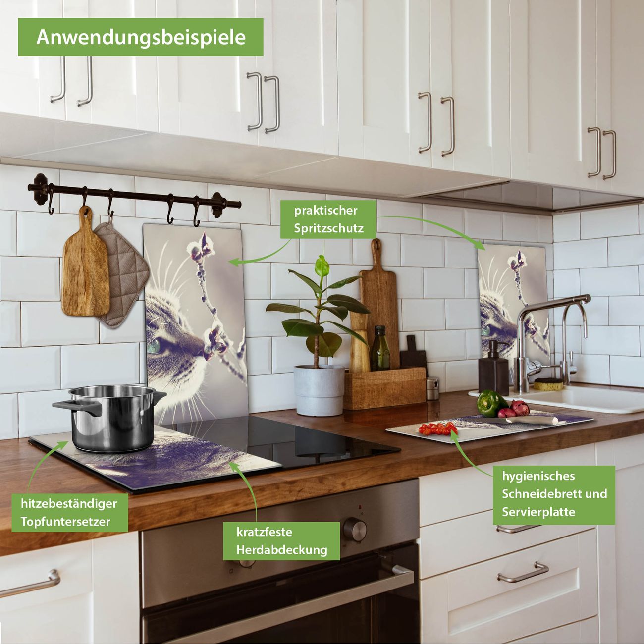 VIELSEITIG: Die Ceranfeldabdeckung ist vielseitig einsetzbar: ob als Spritzschutz hinter dem Herd für Ihre Küche oder als Glas Schneidebrett als hygienische und geruchsneutrale Unterlage. Sie können ebenfalls heiße Töpfe und Pfannen bis 100°C auf der Herdplattenabdeckung abstellen. Sie erhalten ein Multitalent für Ihre Küche. Die banjado Herdabdeckplatte aus Glas mit Motiv Weidenkätzchen verdeckt mit einem schönen Motiv Ihr Ceranfeld bzw. Ihren Induktionsherd. Die Herdabdeckplatte ist vielseitig einsetzbar und passt sich dabei Ihrem Einrichtungsstil an. DESIGN: Die Herdabdeckung Weidenkätzchen besteht aus hochwertigem, gehärtetem Glas mit einem unserer zahlreichen Motive. Sie haben die Wahl zwischen verschiedenen Maßen von einteiligen, zweiteiligen und einer dreiteiligen Herdabdeckung. Wählen Sie was zu Ihrer Einrichtung passt! DETAILS: Die Herdabdeckplatte ist vielseitig einsetzbar. Die Ecken sind für mehr Sicherheit dezent abgerundet, das Glas ist gehärtet. Sie erhalten separate Gummi Abstandshalter, damit Ihre Abdeckung rutschfest auf dem Herd steht. Diese können Sie frei positionieren, sodass die Herdabdeckung perfekt auf Ihrem Ceranfeld sitzt. BANJADO: Wir sind ein kleines Team aus dem Herzen von Sachsen und fertigen jeden Artikel nach Bestellung eigens für Sie an. Sie erhalten also keine preiswerte Importware, sondern Handarbeit. Auf Wunsch sind auch andere Farben und Größen möglich, kontakierten Sie uns gern.