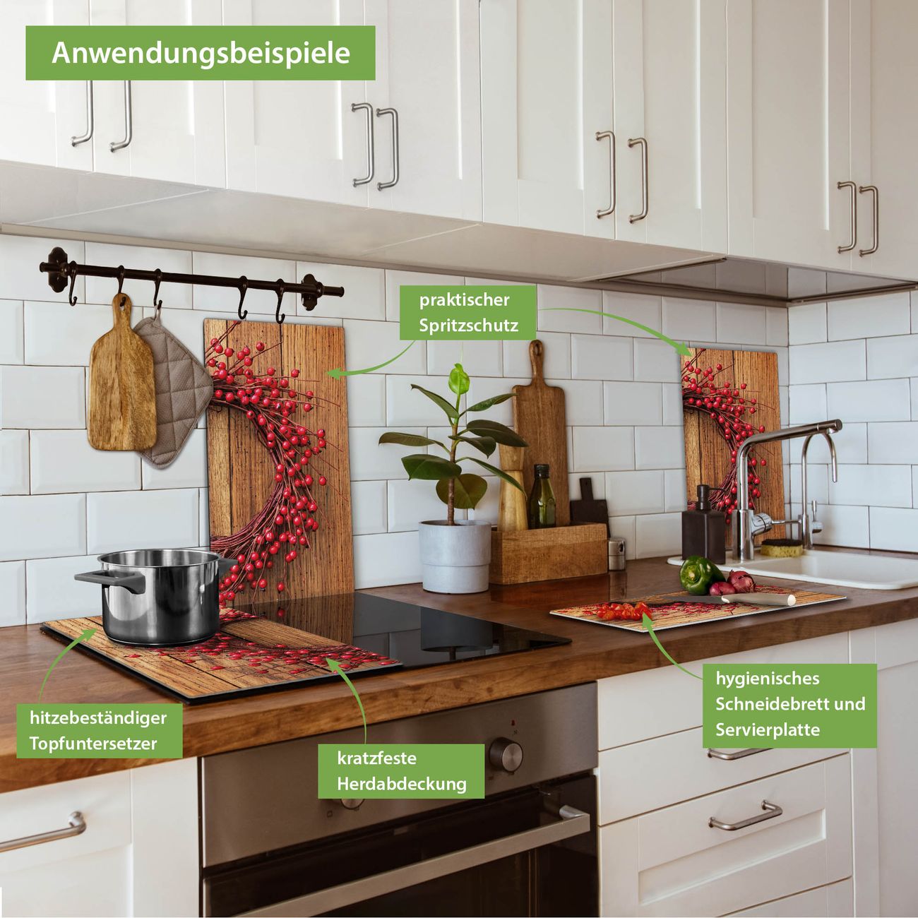 VIELSEITIG: Die Ceranfeldabdeckung ist vielseitig einsetzbar: ob als Spritzschutz hinter dem Herd für Ihre Küche oder als Glas Schneidebrett als hygienische und geruchsneutrale Unterlage. Sie können ebenfalls heiße Töpfe und Pfannen bis 100°C auf der Herdplattenabdeckung abstellen. Sie erhalten ein Multitalent für Ihre Küche. Die banjado Herdabdeckplatte aus Glas mit Motiv Weihnachtskranz verdeckt mit einem schönen Motiv Ihr Ceranfeld bzw. Ihren Induktionsherd. Die Herdabdeckplatte ist vielseitig einsetzbar und passt sich dabei Ihrem Einrichtungsstil an. DESIGN: Die Herdabdeckung Weihnachtskranz besteht aus hochwertigem, gehärtetem Glas mit einem unserer zahlreichen Motive. Sie haben die Wahl zwischen verschiedenen Maßen von einteiligen, zweiteiligen und einer dreiteiligen Herdabdeckung. Wählen Sie was zu Ihrer Einrichtung passt! DETAILS: Die Herdabdeckplatte ist vielseitig einsetzbar. Die Ecken sind für mehr Sicherheit dezent abgerundet, das Glas ist gehärtet. Sie erhalten separate Gummi Abstandshalter, damit Ihre Abdeckung rutschfest auf dem Herd steht. Diese können Sie frei positionieren, sodass die Herdabdeckung perfekt auf Ihrem Ceranfeld sitzt. BANJADO: Wir sind ein kleines Team aus dem Herzen von Sachsen und fertigen jeden Artikel nach Bestellung eigens für Sie an. Sie erhalten also keine preiswerte Importware, sondern Handarbeit. Auf Wunsch sind auch andere Farben und Größen möglich, kontakierten Sie uns gern.
