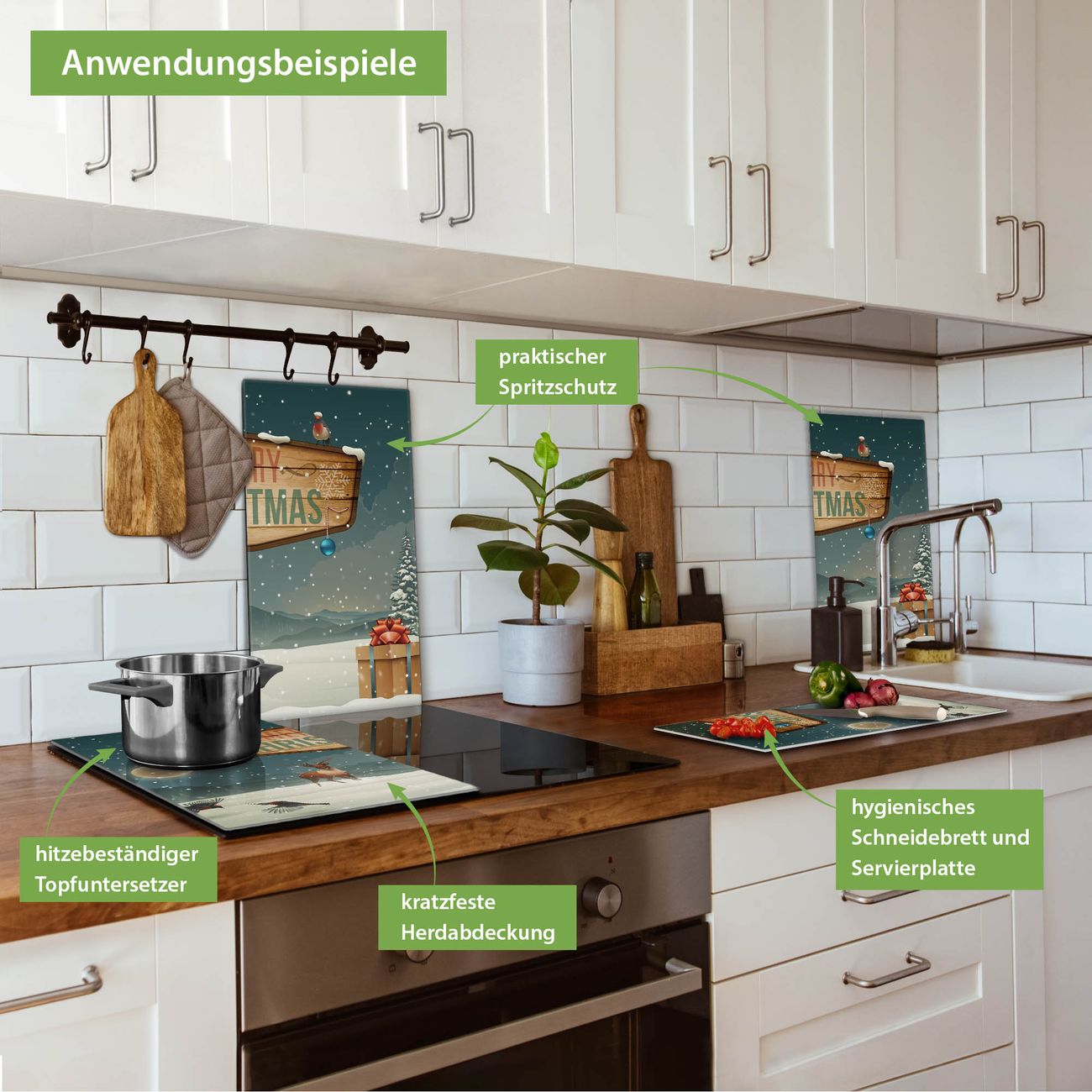 VIELSEITIG: Die Ceranfeldabdeckung ist vielseitig einsetzbar: ob als Spritzschutz hinter dem Herd für Ihre Küche oder als Glas Schneidebrett als hygienische und geruchsneutrale Unterlage. Sie können ebenfalls heiße Töpfe und Pfannen bis 100°C auf der Herdplattenabdeckung abstellen. Sie erhalten ein Multitalent für Ihre Küche. Die banjado Herdabdeckplatte aus Glas mit Motiv Weihnachtsland verdeckt mit einem schönen Motiv Ihr Ceranfeld bzw. Ihren Induktionsherd. Die Herdabdeckplatte ist vielseitig einsetzbar und passt sich dabei Ihrem Einrichtungsstil an. DESIGN: Die Herdabdeckung Weihnachtsland besteht aus hochwertigem, gehärtetem Glas mit einem unserer zahlreichen Motive. Sie haben die Wahl zwischen verschiedenen Maßen von einteiligen, zweiteiligen und einer dreiteiligen Herdabdeckung. Wählen Sie was zu Ihrer Einrichtung passt! DETAILS: Die Herdabdeckplatte ist vielseitig einsetzbar. Die Ecken sind für mehr Sicherheit dezent abgerundet, das Glas ist gehärtet. Sie erhalten separate Gummi Abstandshalter, damit Ihre Abdeckung rutschfest auf dem Herd steht. Diese können Sie frei positionieren, sodass die Herdabdeckung perfekt auf Ihrem Ceranfeld sitzt. BANJADO: Wir sind ein kleines Team aus dem Herzen von Sachsen und fertigen jeden Artikel nach Bestellung eigens für Sie an. Sie erhalten also keine preiswerte Importware, sondern Handarbeit. Auf Wunsch sind auch andere Farben und Größen möglich, kontakierten Sie uns gern.