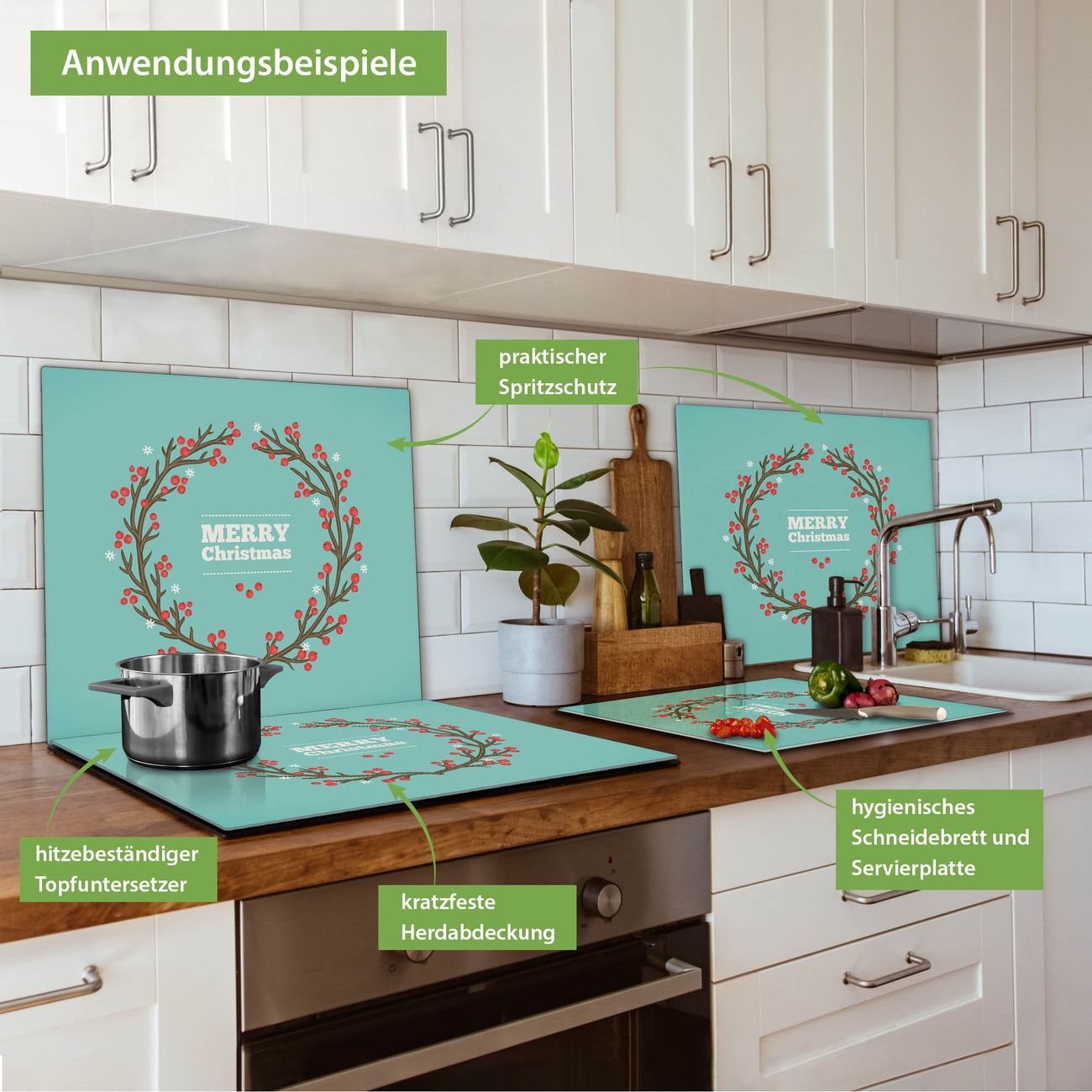 VIELSEITIG: Die Ceranfeldabdeckung ist vielseitig einsetzbar: ob als Spritzschutz hinter dem Herd für Ihre Küche oder als Glas Schneidebrett als hygienische und geruchsneutrale Unterlage. Sie können ebenfalls heiße Töpfe und Pfannen bis 100°C auf der Herdplattenabdeckung abstellen. Sie erhalten ein Multitalent für Ihre Küche. Die banjado Herdabdeckplatte aus Glas mit Motiv Weihnachtsranke verdeckt mit einem schönen Motiv Ihr Ceranfeld bzw. Ihren Induktionsherd. Die Herdabdeckplatte ist vielseitig einsetzbar und passt sich dabei Ihrem Einrichtungsstil an. DESIGN: Die Herdabdeckung Weihnachtsranke besteht aus hochwertigem, gehärtetem Glas mit einem unserer zahlreichen Motive. Sie haben die Wahl zwischen verschiedenen Maßen von einteiligen, zweiteiligen und einer dreiteiligen Herdabdeckung. Wählen Sie was zu Ihrer Einrichtung passt! DETAILS: Die Herdabdeckplatte ist vielseitig einsetzbar. Die Ecken sind für mehr Sicherheit dezent abgerundet, das Glas ist gehärtet. Sie erhalten separate Gummi Abstandshalter, damit Ihre Abdeckung rutschfest auf dem Herd steht. Diese können Sie frei positionieren, sodass die Herdabdeckung perfekt auf Ihrem Ceranfeld sitzt. BANJADO: Wir sind ein kleines Team aus dem Herzen von Sachsen und fertigen jeden Artikel nach Bestellung eigens für Sie an. Sie erhalten also keine preiswerte Importware, sondern Handarbeit. Auf Wunsch sind auch andere Farben und Größen möglich, kontakierten Sie uns gern.