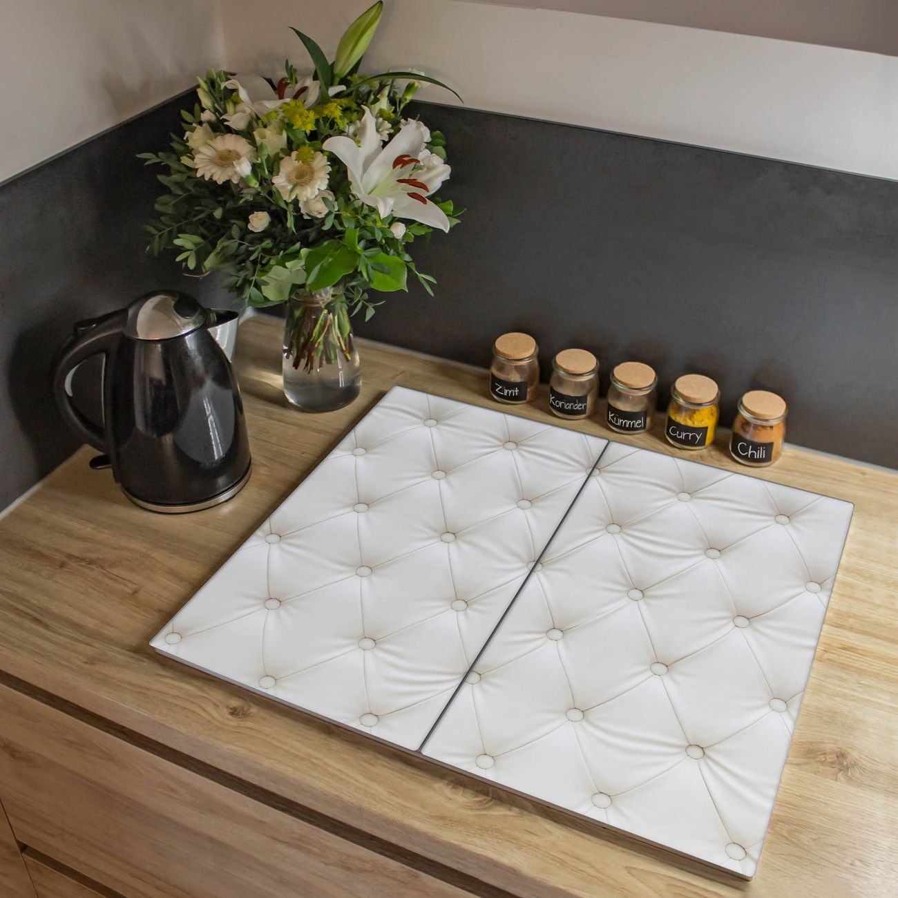 VIELSEITIG: Die Ceranfeldabdeckung ist vielseitig einsetzbar: ob als Spritzschutz hinter dem Herd für Ihre Küche oder als Glas Schneidebrett als hygienische und geruchsneutrale Unterlage. Sie können ebenfalls heiße Töpfe und Pfannen bis 100°C auf der Herdplattenabdeckung abstellen. Sie erhalten ein Multitalent für Ihre Küche. Die banjado Herdabdeckplatte aus Glas mit Motiv Weißes Polster verdeckt mit einem schönen Motiv Ihr Ceranfeld bzw. Ihren Induktionsherd. Die Herdabdeckplatte ist vielseitig einsetzbar und passt sich dabei Ihrem Einrichtungsstil an. DESIGN: Die Herdabdeckung Weißes Polster besteht aus hochwertigem, gehärtetem Glas mit einem unserer zahlreichen Motive. Sie haben die Wahl zwischen verschiedenen Maßen von einteiligen, zweiteiligen und einer dreiteiligen Herdabdeckung. Wählen Sie was zu Ihrer Einrichtung passt! DETAILS: Die Herdabdeckplatte ist vielseitig einsetzbar. Die Ecken sind für mehr Sicherheit dezent abgerundet, das Glas ist gehärtet. Sie erhalten separate Gummi Abstandshalter, damit Ihre Abdeckung rutschfest auf dem Herd steht. Diese können Sie frei positionieren, sodass die Herdabdeckung perfekt auf Ihrem Ceranfeld sitzt. BANJADO: Wir sind ein kleines Team aus dem Herzen von Sachsen und fertigen jeden Artikel nach Bestellung eigens für Sie an. Sie erhalten also keine preiswerte Importware, sondern Handarbeit. Auf Wunsch sind auch andere Farben und Größen möglich, kontakierten Sie uns gern.