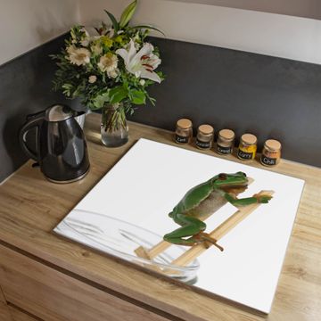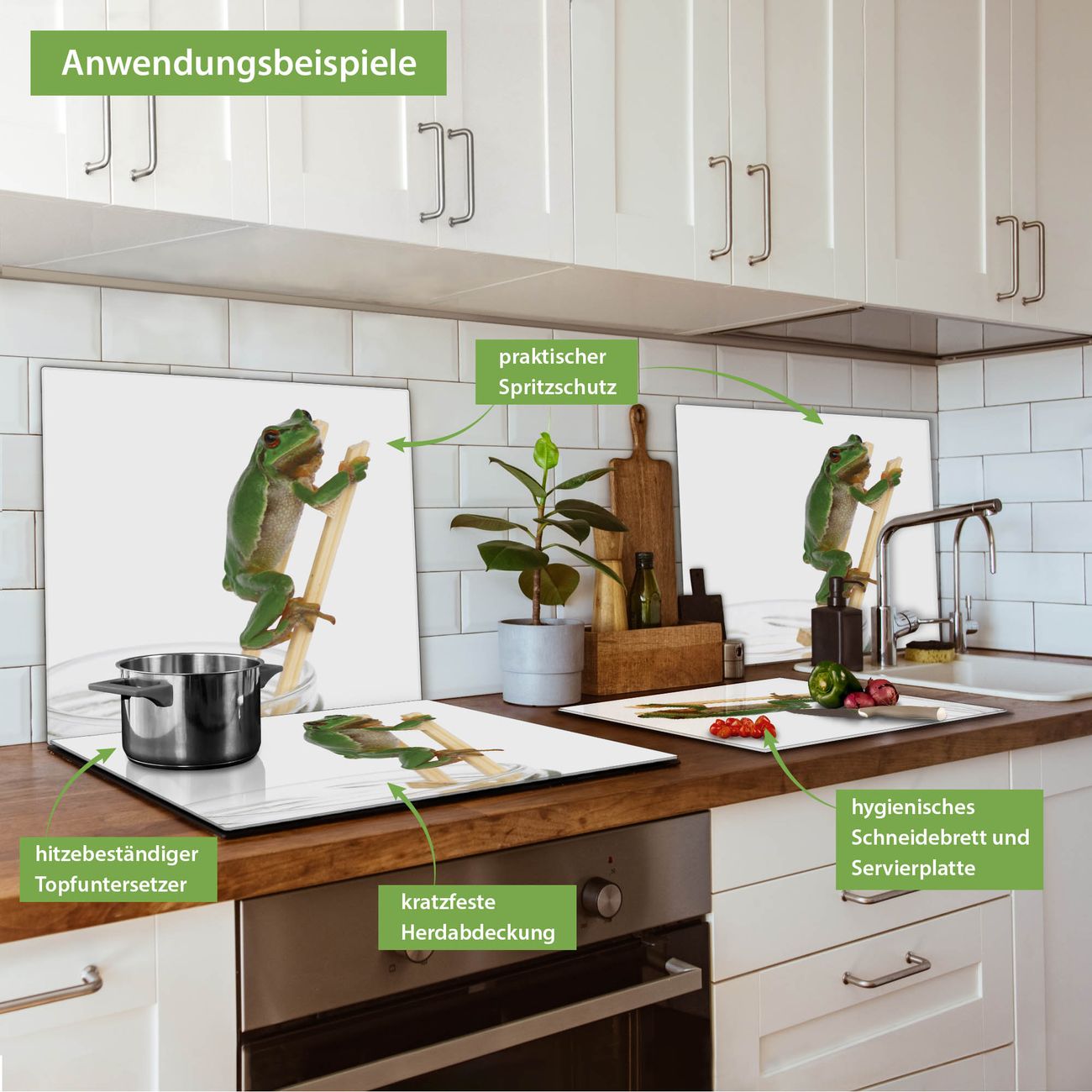 VIELSEITIG: Die Ceranfeldabdeckung ist vielseitig einsetzbar: ob als Spritzschutz hinter dem Herd für Ihre Küche oder als Glas Schneidebrett als hygienische und geruchsneutrale Unterlage. Sie können ebenfalls heiße Töpfe und Pfannen bis 100°C auf der Herdplattenabdeckung abstellen. Sie erhalten ein Multitalent für Ihre Küche. Die banjado Herdabdeckplatte aus Glas mit Motiv Wetterfrosch verdeckt mit einem schönen Motiv Ihr Ceranfeld bzw. Ihren Induktionsherd. Die Herdabdeckplatte ist vielseitig einsetzbar und passt sich dabei Ihrem Einrichtungsstil an. DESIGN: Die Herdabdeckung Wetterfrosch besteht aus hochwertigem, gehärtetem Glas mit einem unserer zahlreichen Motive. Sie haben die Wahl zwischen verschiedenen Maßen von einteiligen, zweiteiligen und einer dreiteiligen Herdabdeckung. Wählen Sie was zu Ihrer Einrichtung passt! DETAILS: Die Herdabdeckplatte ist vielseitig einsetzbar. Die Ecken sind für mehr Sicherheit dezent abgerundet, das Glas ist gehärtet. Sie erhalten separate Gummi Abstandshalter, damit Ihre Abdeckung rutschfest auf dem Herd steht. Diese können Sie frei positionieren, sodass die Herdabdeckung perfekt auf Ihrem Ceranfeld sitzt. BANJADO: Wir sind ein kleines Team aus dem Herzen von Sachsen und fertigen jeden Artikel nach Bestellung eigens für Sie an. Sie erhalten also keine preiswerte Importware, sondern Handarbeit. Auf Wunsch sind auch andere Farben und Größen möglich, kontakierten Sie uns gern.