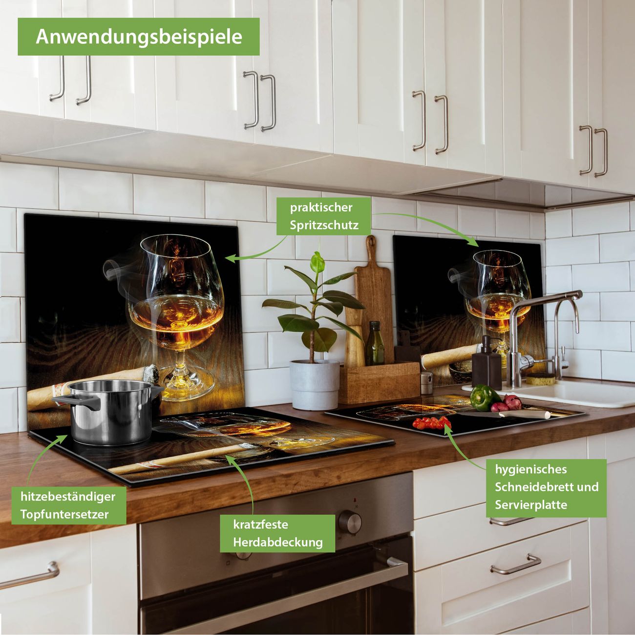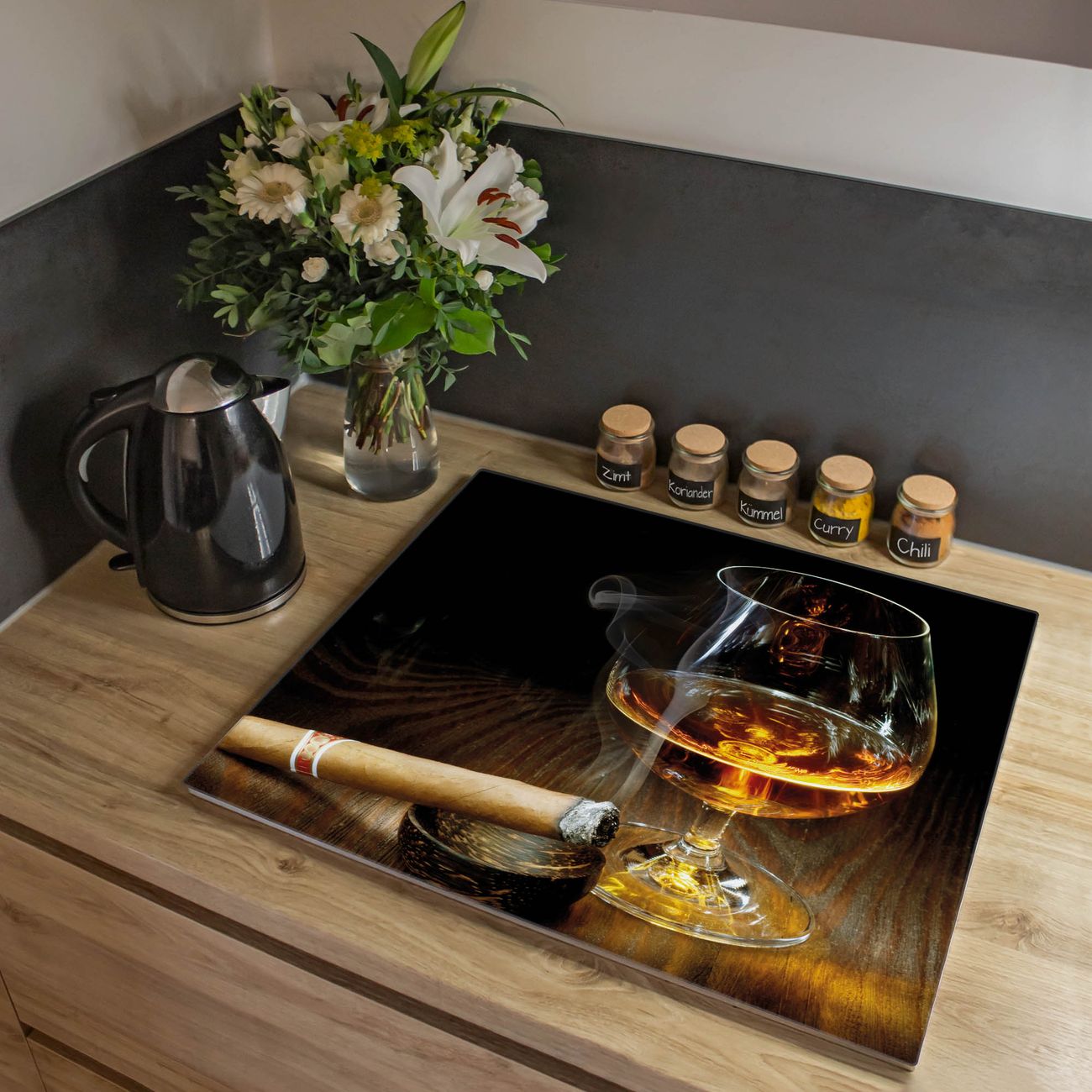 VIELSEITIG: Die Ceranfeldabdeckung ist vielseitig einsetzbar: ob als Spritzschutz hinter dem Herd für Ihre Küche oder als Glas Schneidebrett als hygienische und geruchsneutrale Unterlage. Sie können ebenfalls heiße Töpfe und Pfannen bis 100°C auf der Herdplattenabdeckung abstellen. Sie erhalten ein Multitalent für Ihre Küche. Die banjado Herdabdeckplatte aus Glas mit Motiv Whiskey & Cigar verdeckt mit einem schönen Motiv Ihr Ceranfeld bzw. Ihren Induktionsherd. Die Herdabdeckplatte ist vielseitig einsetzbar und passt sich dabei Ihrem Einrichtungsstil an. DESIGN: Die Herdabdeckung Whiskey & Cigar besteht aus hochwertigem, gehärtetem Glas mit einem unserer zahlreichen Motive. Sie haben die Wahl zwischen verschiedenen Maßen von einteiligen, zweiteiligen und einer dreiteiligen Herdabdeckung. Wählen Sie was zu Ihrer Einrichtung passt! DETAILS: Die Herdabdeckplatte ist vielseitig einsetzbar. Die Ecken sind für mehr Sicherheit dezent abgerundet, das Glas ist gehärtet. Sie erhalten separate Gummi Abstandshalter, damit Ihre Abdeckung rutschfest auf dem Herd steht. Diese können Sie frei positionieren, sodass die Herdabdeckung perfekt auf Ihrem Ceranfeld sitzt. BANJADO: Wir sind ein kleines Team aus dem Herzen von Sachsen und fertigen jeden Artikel nach Bestellung eigens für Sie an. Sie erhalten also keine preiswerte Importware, sondern Handarbeit. Auf Wunsch sind auch andere Farben und Größen möglich, kontakierten Sie uns gern.