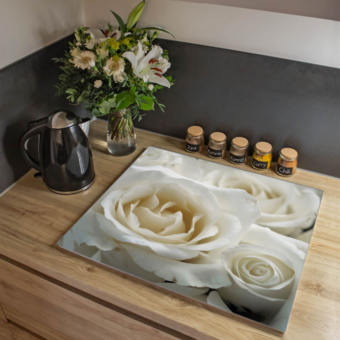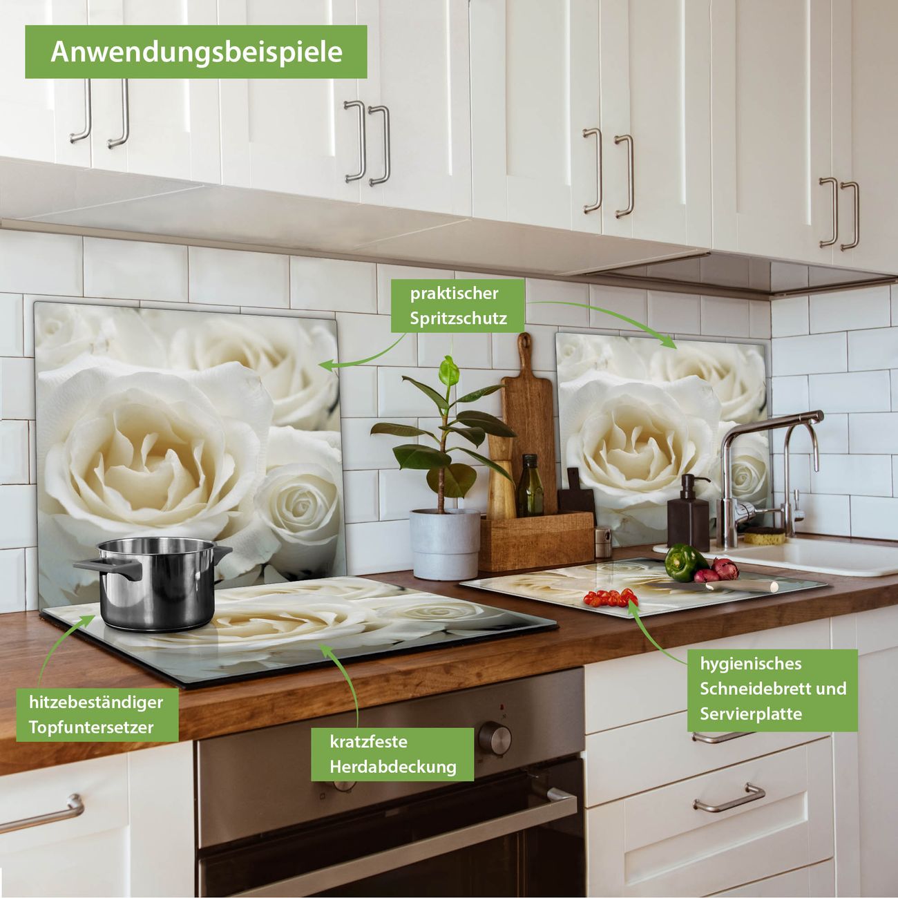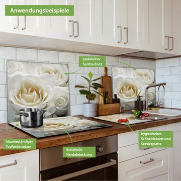 VIELSEITIG: Die Ceranfeldabdeckung ist vielseitig einsetzbar: ob als Spritzschutz hinter dem Herd für Ihre Küche oder als Glas Schneidebrett als hygienische und geruchsneutrale Unterlage. Sie können ebenfalls heiße Töpfe und Pfannen bis 100°C auf der Herdplattenabdeckung abstellen. Sie erhalten ein Multitalent für Ihre Küche. Die banjado Herdabdeckplatte aus Glas mit Motiv White Roses verdeckt mit einem schönen Motiv Ihr Ceranfeld bzw. Ihren Induktionsherd. Die Herdabdeckplatte ist vielseitig einsetzbar und passt sich dabei Ihrem Einrichtungsstil an. DESIGN: Die Herdabdeckung White Roses besteht aus hochwertigem, gehärtetem Glas mit einem unserer zahlreichen Motive. Sie haben die Wahl zwischen verschiedenen Maßen von einteiligen, zweiteiligen und einer dreiteiligen Herdabdeckung. Wählen Sie was zu Ihrer Einrichtung passt! DETAILS: Die Herdabdeckplatte ist vielseitig einsetzbar. Die Ecken sind für mehr Sicherheit dezent abgerundet, das Glas ist gehärtet. Sie erhalten separate Gummi Abstandshalter, damit Ihre Abdeckung rutschfest auf dem Herd steht. Diese können Sie frei positionieren, sodass die Herdabdeckung perfekt auf Ihrem Ceranfeld sitzt. BANJADO: Wir sind ein kleines Team aus dem Herzen von Sachsen und fertigen jeden Artikel nach Bestellung eigens für Sie an. Sie erhalten also keine preiswerte Importware, sondern Handarbeit. Auf Wunsch sind auch andere Farben und Größen möglich, kontakierten Sie uns gern.