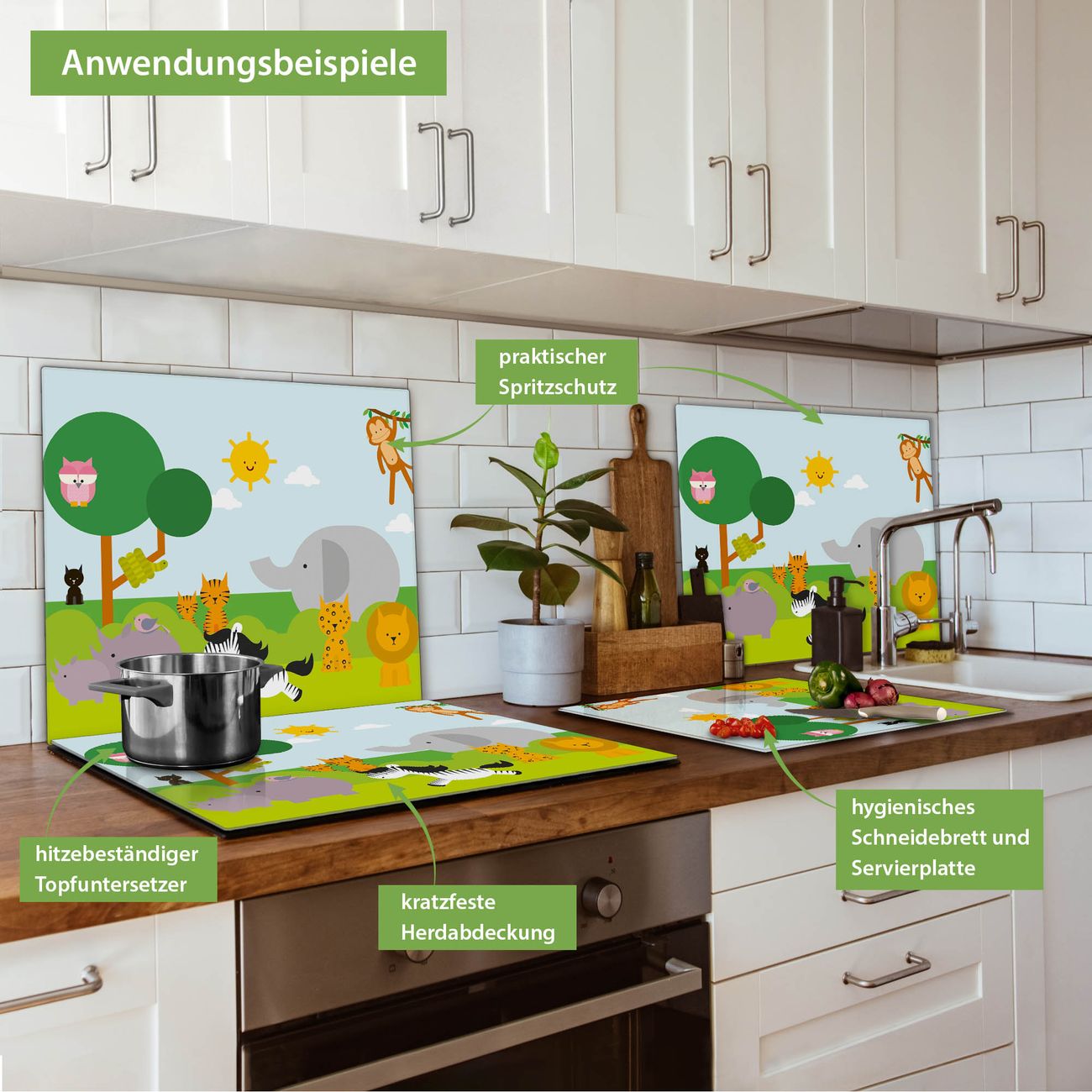 VIELSEITIG: Die Ceranfeldabdeckung ist vielseitig einsetzbar: ob als Spritzschutz hinter dem Herd für Ihre Küche oder als Glas Schneidebrett als hygienische und geruchsneutrale Unterlage. Sie können ebenfalls heiße Töpfe und Pfannen bis 100°C auf der Herdplattenabdeckung abstellen. Sie erhalten ein Multitalent für Ihre Küche. Die banjado Herdabdeckplatte aus Glas mit Motiv Wilde Tiere verdeckt mit einem schönen Motiv Ihr Ceranfeld bzw. Ihren Induktionsherd. Die Herdabdeckplatte ist vielseitig einsetzbar und passt sich dabei Ihrem Einrichtungsstil an. DESIGN: Die Herdabdeckung Wilde Tiere besteht aus hochwertigem, gehärtetem Glas mit einem unserer zahlreichen Motive. Sie haben die Wahl zwischen verschiedenen Maßen von einteiligen, zweiteiligen und einer dreiteiligen Herdabdeckung. Wählen Sie was zu Ihrer Einrichtung passt! DETAILS: Die Herdabdeckplatte ist vielseitig einsetzbar. Die Ecken sind für mehr Sicherheit dezent abgerundet, das Glas ist gehärtet. Sie erhalten separate Gummi Abstandshalter, damit Ihre Abdeckung rutschfest auf dem Herd steht. Diese können Sie frei positionieren, sodass die Herdabdeckung perfekt auf Ihrem Ceranfeld sitzt. BANJADO: Wir sind ein kleines Team aus dem Herzen von Sachsen und fertigen jeden Artikel nach Bestellung eigens für Sie an. Sie erhalten also keine preiswerte Importware, sondern Handarbeit. Auf Wunsch sind auch andere Farben und Größen möglich, kontakierten Sie uns gern.