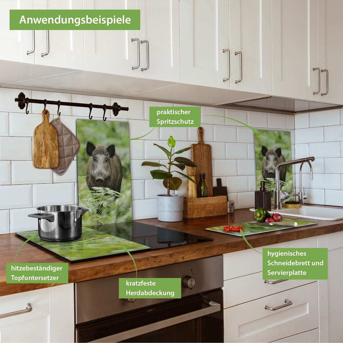 VIELSEITIG: Die Ceranfeldabdeckung ist vielseitig einsetzbar: ob als Spritzschutz hinter dem Herd für Ihre Küche oder als Glas Schneidebrett als hygienische und geruchsneutrale Unterlage. Sie können ebenfalls heiße Töpfe und Pfannen bis 100°C auf der Herdplattenabdeckung abstellen. Sie erhalten ein Multitalent für Ihre Küche. Die banjado Herdabdeckplatte aus Glas mit Motiv Wildschwein verdeckt mit einem schönen Motiv Ihr Ceranfeld bzw. Ihren Induktionsherd. Die Herdabdeckplatte ist vielseitig einsetzbar und passt sich dabei Ihrem Einrichtungsstil an. DESIGN: Die Herdabdeckung Wildschwein besteht aus hochwertigem, gehärtetem Glas mit einem unserer zahlreichen Motive. Sie haben die Wahl zwischen verschiedenen Maßen von einteiligen, zweiteiligen und einer dreiteiligen Herdabdeckung. Wählen Sie was zu Ihrer Einrichtung passt! DETAILS: Die Herdabdeckplatte ist vielseitig einsetzbar. Die Ecken sind für mehr Sicherheit dezent abgerundet, das Glas ist gehärtet. Sie erhalten separate Gummi Abstandshalter, damit Ihre Abdeckung rutschfest auf dem Herd steht. Diese können Sie frei positionieren, sodass die Herdabdeckung perfekt auf Ihrem Ceranfeld sitzt. BANJADO: Wir sind ein kleines Team aus dem Herzen von Sachsen und fertigen jeden Artikel nach Bestellung eigens für Sie an. Sie erhalten also keine preiswerte Importware, sondern Handarbeit. Auf Wunsch sind auch andere Farben und Größen möglich, kontakierten Sie uns gern.