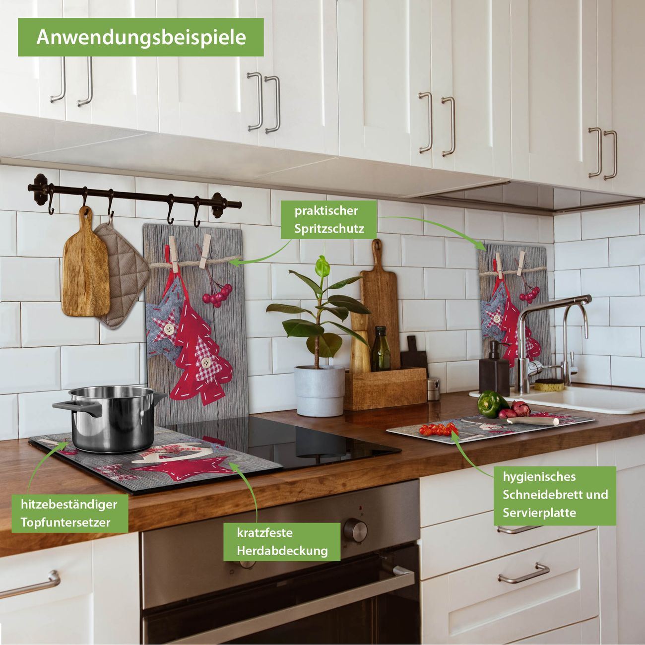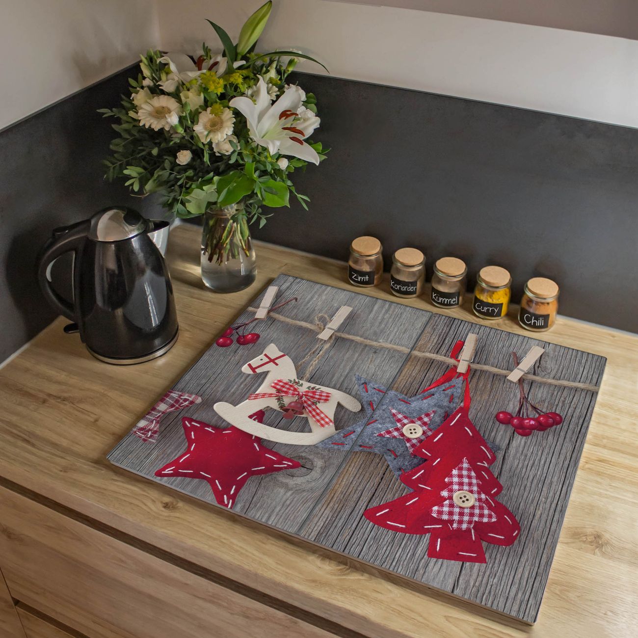 VIELSEITIG: Die Ceranfeldabdeckung ist vielseitig einsetzbar: ob als Spritzschutz hinter dem Herd für Ihre Küche oder als Glas Schneidebrett als hygienische und geruchsneutrale Unterlage. Sie können ebenfalls heiße Töpfe und Pfannen bis 100°C auf der Herdplattenabdeckung abstellen. Sie erhalten ein Multitalent für Ihre Küche. Die banjado Herdabdeckplatte aus Glas mit Motiv Winterdekoration verdeckt mit einem schönen Motiv Ihr Ceranfeld bzw. Ihren Induktionsherd. Die Herdabdeckplatte ist vielseitig einsetzbar und passt sich dabei Ihrem Einrichtungsstil an. DESIGN: Die Herdabdeckung Winterdekoration besteht aus hochwertigem, gehärtetem Glas mit einem unserer zahlreichen Motive. Sie haben die Wahl zwischen verschiedenen Maßen von einteiligen, zweiteiligen und einer dreiteiligen Herdabdeckung. Wählen Sie was zu Ihrer Einrichtung passt! DETAILS: Die Herdabdeckplatte ist vielseitig einsetzbar. Die Ecken sind für mehr Sicherheit dezent abgerundet, das Glas ist gehärtet. Sie erhalten separate Gummi Abstandshalter, damit Ihre Abdeckung rutschfest auf dem Herd steht. Diese können Sie frei positionieren, sodass die Herdabdeckung perfekt auf Ihrem Ceranfeld sitzt. BANJADO: Wir sind ein kleines Team aus dem Herzen von Sachsen und fertigen jeden Artikel nach Bestellung eigens für Sie an. Sie erhalten also keine preiswerte Importware, sondern Handarbeit. Auf Wunsch sind auch andere Farben und Größen möglich, kontakierten Sie uns gern.