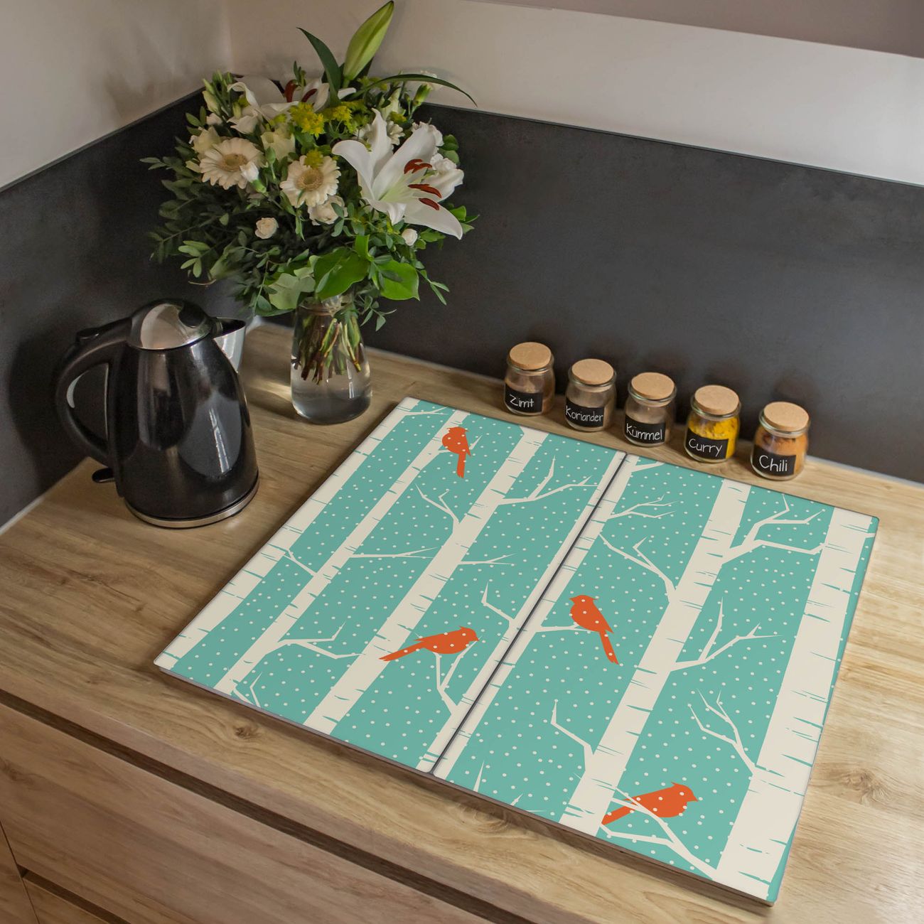 VIELSEITIG: Die Ceranfeldabdeckung ist vielseitig einsetzbar: ob als Spritzschutz hinter dem Herd für Ihre Küche oder als Glas Schneidebrett als hygienische und geruchsneutrale Unterlage. Sie können ebenfalls heiße Töpfe und Pfannen bis 100°C auf der Herdplattenabdeckung abstellen. Sie erhalten ein Multitalent für Ihre Küche. Die banjado Herdabdeckplatte aus Glas mit Motiv Wintervögel verdeckt mit einem schönen Motiv Ihr Ceranfeld bzw. Ihren Induktionsherd. Die Herdabdeckplatte ist vielseitig einsetzbar und passt sich dabei Ihrem Einrichtungsstil an. DESIGN: Die Herdabdeckung Wintervögel besteht aus hochwertigem, gehärtetem Glas mit einem unserer zahlreichen Motive. Sie haben die Wahl zwischen verschiedenen Maßen von einteiligen, zweiteiligen und einer dreiteiligen Herdabdeckung. Wählen Sie was zu Ihrer Einrichtung passt! DETAILS: Die Herdabdeckplatte ist vielseitig einsetzbar. Die Ecken sind für mehr Sicherheit dezent abgerundet, das Glas ist gehärtet. Sie erhalten separate Gummi Abstandshalter, damit Ihre Abdeckung rutschfest auf dem Herd steht. Diese können Sie frei positionieren, sodass die Herdabdeckung perfekt auf Ihrem Ceranfeld sitzt. BANJADO: Wir sind ein kleines Team aus dem Herzen von Sachsen und fertigen jeden Artikel nach Bestellung eigens für Sie an. Sie erhalten also keine preiswerte Importware, sondern Handarbeit. Auf Wunsch sind auch andere Farben und Größen möglich, kontakierten Sie uns gern.