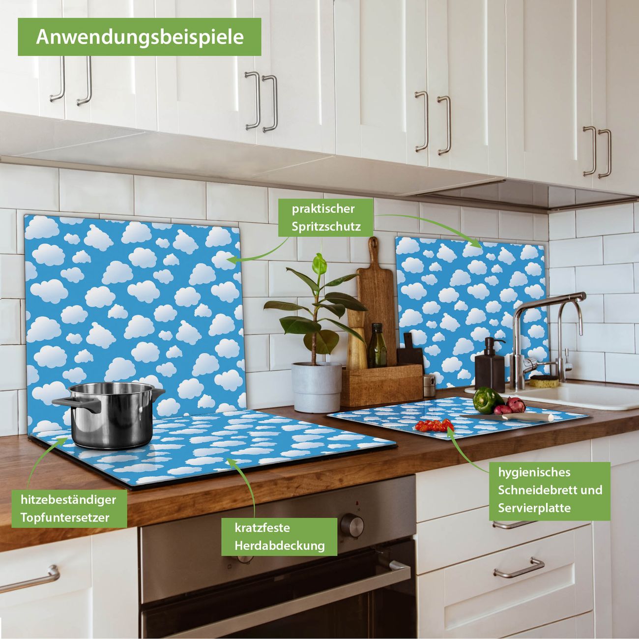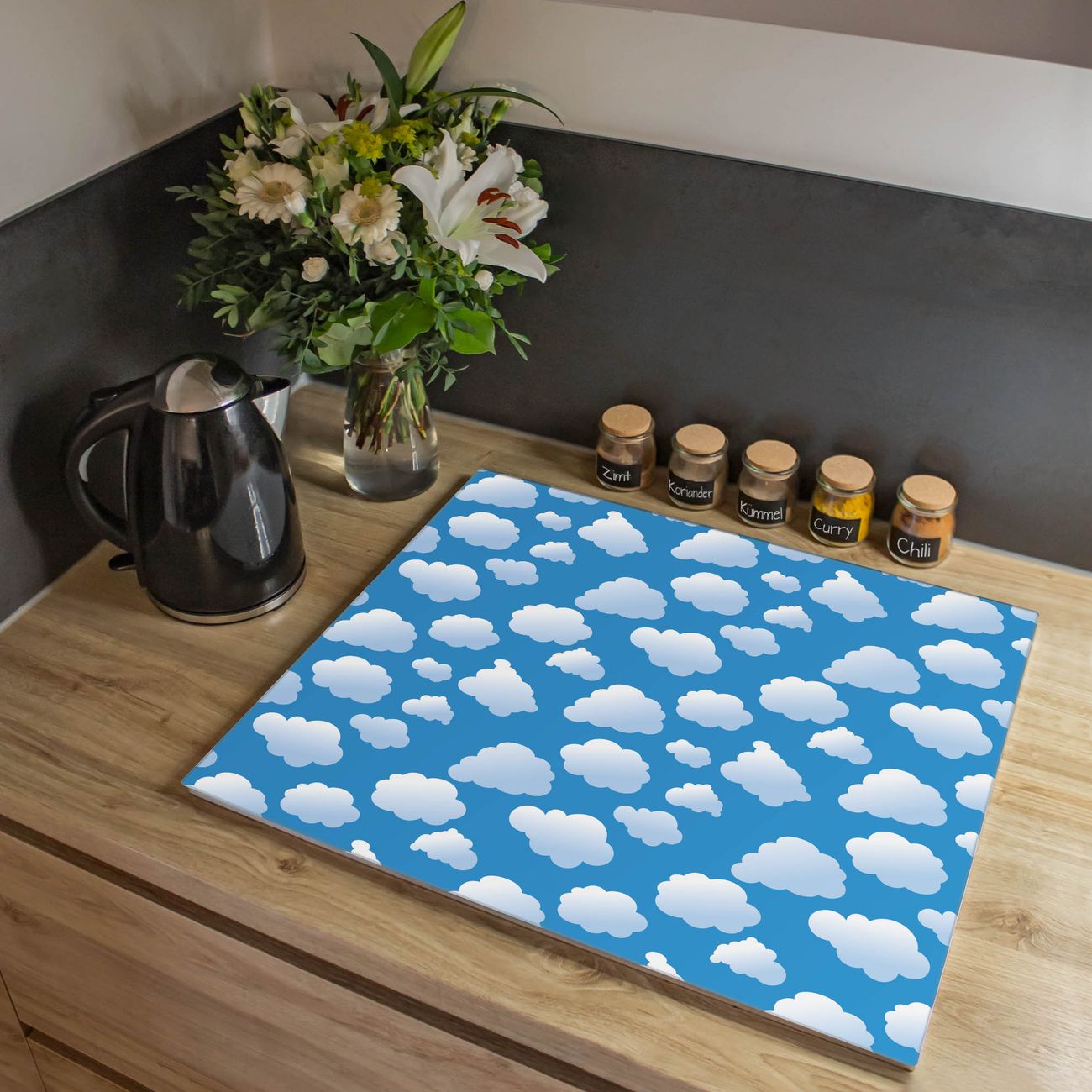VIELSEITIG: Die Ceranfeldabdeckung ist vielseitig einsetzbar: ob als Spritzschutz hinter dem Herd für Ihre Küche oder als Glas Schneidebrett als hygienische und geruchsneutrale Unterlage. Sie können ebenfalls heiße Töpfe und Pfannen bis 100°C auf der Herdplattenabdeckung abstellen. Sie erhalten ein Multitalent für Ihre Küche. Die banjado Herdabdeckplatte aus Glas mit Motiv Wölkchen verdeckt mit einem schönen Motiv Ihr Ceranfeld bzw. Ihren Induktionsherd. Die Herdabdeckplatte ist vielseitig einsetzbar und passt sich dabei Ihrem Einrichtungsstil an. DESIGN: Die Herdabdeckung Wölkchen besteht aus hochwertigem, gehärtetem Glas mit einem unserer zahlreichen Motive. Sie haben die Wahl zwischen verschiedenen Maßen von einteiligen, zweiteiligen und einer dreiteiligen Herdabdeckung. Wählen Sie was zu Ihrer Einrichtung passt! DETAILS: Die Herdabdeckplatte ist vielseitig einsetzbar. Die Ecken sind für mehr Sicherheit dezent abgerundet, das Glas ist gehärtet. Sie erhalten separate Gummi Abstandshalter, damit Ihre Abdeckung rutschfest auf dem Herd steht. Diese können Sie frei positionieren, sodass die Herdabdeckung perfekt auf Ihrem Ceranfeld sitzt. BANJADO: Wir sind ein kleines Team aus dem Herzen von Sachsen und fertigen jeden Artikel nach Bestellung eigens für Sie an. Sie erhalten also keine preiswerte Importware, sondern Handarbeit. Auf Wunsch sind auch andere Farben und Größen möglich, kontakierten Sie uns gern.
