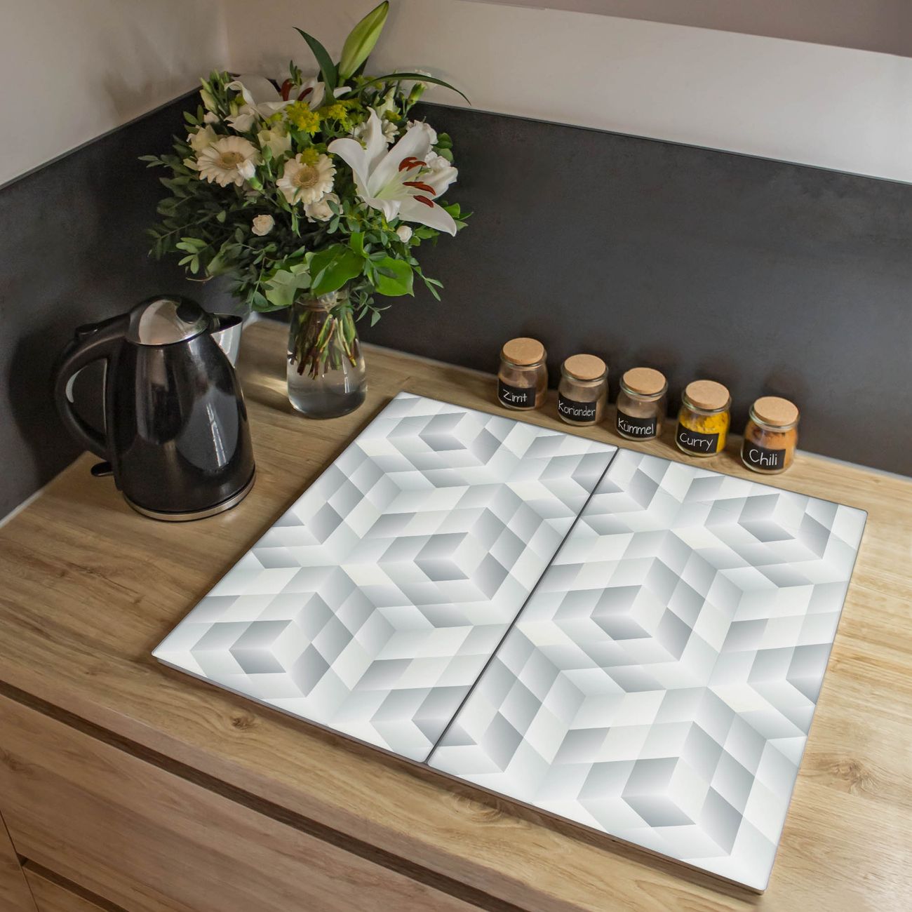 VIELSEITIG: Die Ceranfeldabdeckung ist vielseitig einsetzbar: ob als Spritzschutz hinter dem Herd für Ihre Küche oder als Glas Schneidebrett als hygienische und geruchsneutrale Unterlage. Sie können ebenfalls heiße Töpfe und Pfannen bis 100°C auf der Herdplattenabdeckung abstellen. Sie erhalten ein Multitalent für Ihre Küche. Die banjado Herdabdeckplatte aus Glas mit Motiv Würfel Grau verdeckt mit einem schönen Motiv Ihr Ceranfeld bzw. Ihren Induktionsherd. Die Herdabdeckplatte ist vielseitig einsetzbar und passt sich dabei Ihrem Einrichtungsstil an. DESIGN: Die Herdabdeckung Würfel Grau besteht aus hochwertigem, gehärtetem Glas mit einem unserer zahlreichen Motive. Sie haben die Wahl zwischen verschiedenen Maßen von einteiligen, zweiteiligen und einer dreiteiligen Herdabdeckung. Wählen Sie was zu Ihrer Einrichtung passt! DETAILS: Die Herdabdeckplatte ist vielseitig einsetzbar. Die Ecken sind für mehr Sicherheit dezent abgerundet, das Glas ist gehärtet. Sie erhalten separate Gummi Abstandshalter, damit Ihre Abdeckung rutschfest auf dem Herd steht. Diese können Sie frei positionieren, sodass die Herdabdeckung perfekt auf Ihrem Ceranfeld sitzt. BANJADO: Wir sind ein kleines Team aus dem Herzen von Sachsen und fertigen jeden Artikel nach Bestellung eigens für Sie an. Sie erhalten also keine preiswerte Importware, sondern Handarbeit. Auf Wunsch sind auch andere Farben und Größen möglich, kontakierten Sie uns gern.