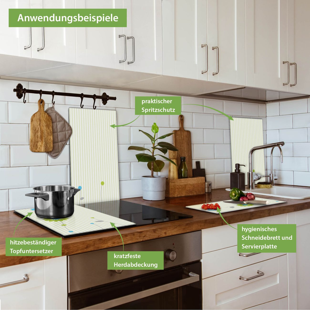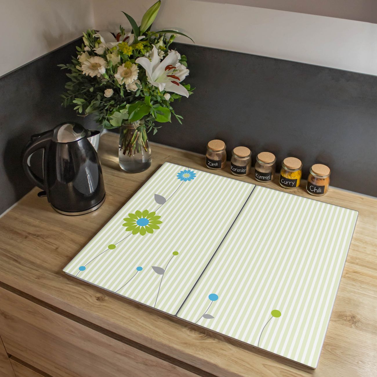 VIELSEITIG: Die Ceranfeldabdeckung ist vielseitig einsetzbar: ob als Spritzschutz hinter dem Herd für Ihre Küche oder als Glas Schneidebrett als hygienische und geruchsneutrale Unterlage. Sie können ebenfalls heiße Töpfe und Pfannen bis 100°C auf der Herdplattenabdeckung abstellen. Sie erhalten ein Multitalent für Ihre Küche. Die banjado Herdabdeckplatte aus Glas mit Motiv Zarte Blumen verdeckt mit einem schönen Motiv Ihr Ceranfeld bzw. Ihren Induktionsherd. Die Herdabdeckplatte ist vielseitig einsetzbar und passt sich dabei Ihrem Einrichtungsstil an. DESIGN: Die Herdabdeckung Zarte Blumen besteht aus hochwertigem, gehärtetem Glas mit einem unserer zahlreichen Motive. Sie haben die Wahl zwischen verschiedenen Maßen von einteiligen, zweiteiligen und einer dreiteiligen Herdabdeckung. Wählen Sie was zu Ihrer Einrichtung passt! DETAILS: Die Herdabdeckplatte ist vielseitig einsetzbar. Die Ecken sind für mehr Sicherheit dezent abgerundet, das Glas ist gehärtet. Sie erhalten separate Gummi Abstandshalter, damit Ihre Abdeckung rutschfest auf dem Herd steht. Diese können Sie frei positionieren, sodass die Herdabdeckung perfekt auf Ihrem Ceranfeld sitzt. BANJADO: Wir sind ein kleines Team aus dem Herzen von Sachsen und fertigen jeden Artikel nach Bestellung eigens für Sie an. Sie erhalten also keine preiswerte Importware, sondern Handarbeit. Auf Wunsch sind auch andere Farben und Größen möglich, kontakierten Sie uns gern.