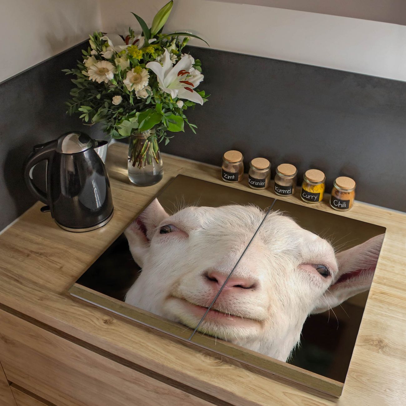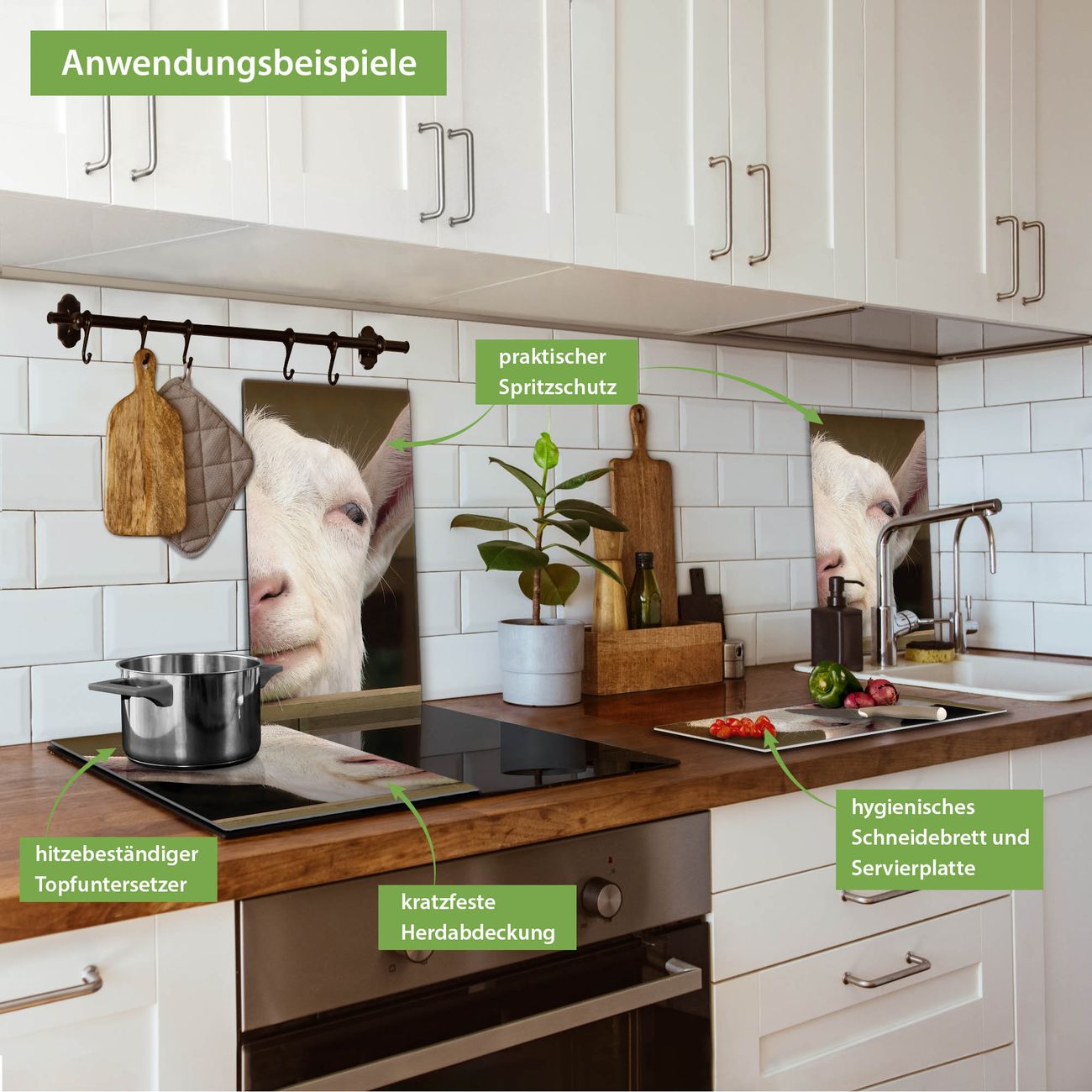 VIELSEITIG: Die Ceranfeldabdeckung ist vielseitig einsetzbar: ob als Spritzschutz hinter dem Herd für Ihre Küche oder als Glas Schneidebrett als hygienische und geruchsneutrale Unterlage. Sie können ebenfalls heiße Töpfe und Pfannen bis 100°C auf der Herdplattenabdeckung abstellen. Sie erhalten ein Multitalent für Ihre Küche. Die banjado Herdabdeckplatte aus Glas mit Motiv Ziege verdeckt mit einem schönen Motiv Ihr Ceranfeld bzw. Ihren Induktionsherd. Die Herdabdeckplatte ist vielseitig einsetzbar und passt sich dabei Ihrem Einrichtungsstil an. DESIGN: Die Herdabdeckung Ziege besteht aus hochwertigem, gehärtetem Glas mit einem unserer zahlreichen Motive. Sie haben die Wahl zwischen verschiedenen Maßen von einteiligen, zweiteiligen und einer dreiteiligen Herdabdeckung. Wählen Sie was zu Ihrer Einrichtung passt! DETAILS: Die Herdabdeckplatte ist vielseitig einsetzbar. Die Ecken sind für mehr Sicherheit dezent abgerundet, das Glas ist gehärtet. Sie erhalten separate Gummi Abstandshalter, damit Ihre Abdeckung rutschfest auf dem Herd steht. Diese können Sie frei positionieren, sodass die Herdabdeckung perfekt auf Ihrem Ceranfeld sitzt. BANJADO: Wir sind ein kleines Team aus dem Herzen von Sachsen und fertigen jeden Artikel nach Bestellung eigens für Sie an. Sie erhalten also keine preiswerte Importware, sondern Handarbeit. Auf Wunsch sind auch andere Farben und Größen möglich, kontakierten Sie uns gern.