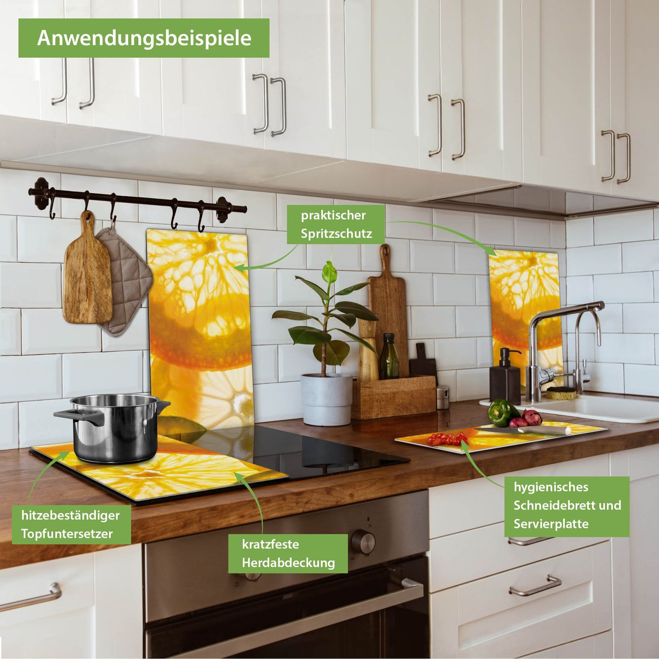 VIELSEITIG: Die Ceranfeldabdeckung ist vielseitig einsetzbar: ob als Spritzschutz hinter dem Herd für Ihre Küche oder als Glas Schneidebrett als hygienische und geruchsneutrale Unterlage. Sie können ebenfalls heiße Töpfe und Pfannen bis 100°C auf der Herdplattenabdeckung abstellen. Sie erhalten ein Multitalent für Ihre Küche. Die banjado Herdabdeckplatte aus Glas mit Motiv Zitrusfrüchte verdeckt mit einem schönen Motiv Ihr Ceranfeld bzw. Ihren Induktionsherd. Die Herdabdeckplatte ist vielseitig einsetzbar und passt sich dabei Ihrem Einrichtungsstil an. DESIGN: Die Herdabdeckung Zitrusfrüchte besteht aus hochwertigem, gehärtetem Glas mit einem unserer zahlreichen Motive. Sie haben die Wahl zwischen verschiedenen Maßen von einteiligen, zweiteiligen und einer dreiteiligen Herdabdeckung. Wählen Sie was zu Ihrer Einrichtung passt! DETAILS: Die Herdabdeckplatte ist vielseitig einsetzbar. Die Ecken sind für mehr Sicherheit dezent abgerundet, das Glas ist gehärtet. Sie erhalten separate Gummi Abstandshalter, damit Ihre Abdeckung rutschfest auf dem Herd steht. Diese können Sie frei positionieren, sodass die Herdabdeckung perfekt auf Ihrem Ceranfeld sitzt. BANJADO: Wir sind ein kleines Team aus dem Herzen von Sachsen und fertigen jeden Artikel nach Bestellung eigens für Sie an. Sie erhalten also keine preiswerte Importware, sondern Handarbeit. Auf Wunsch sind auch andere Farben und Größen möglich, kontakierten Sie uns gern.