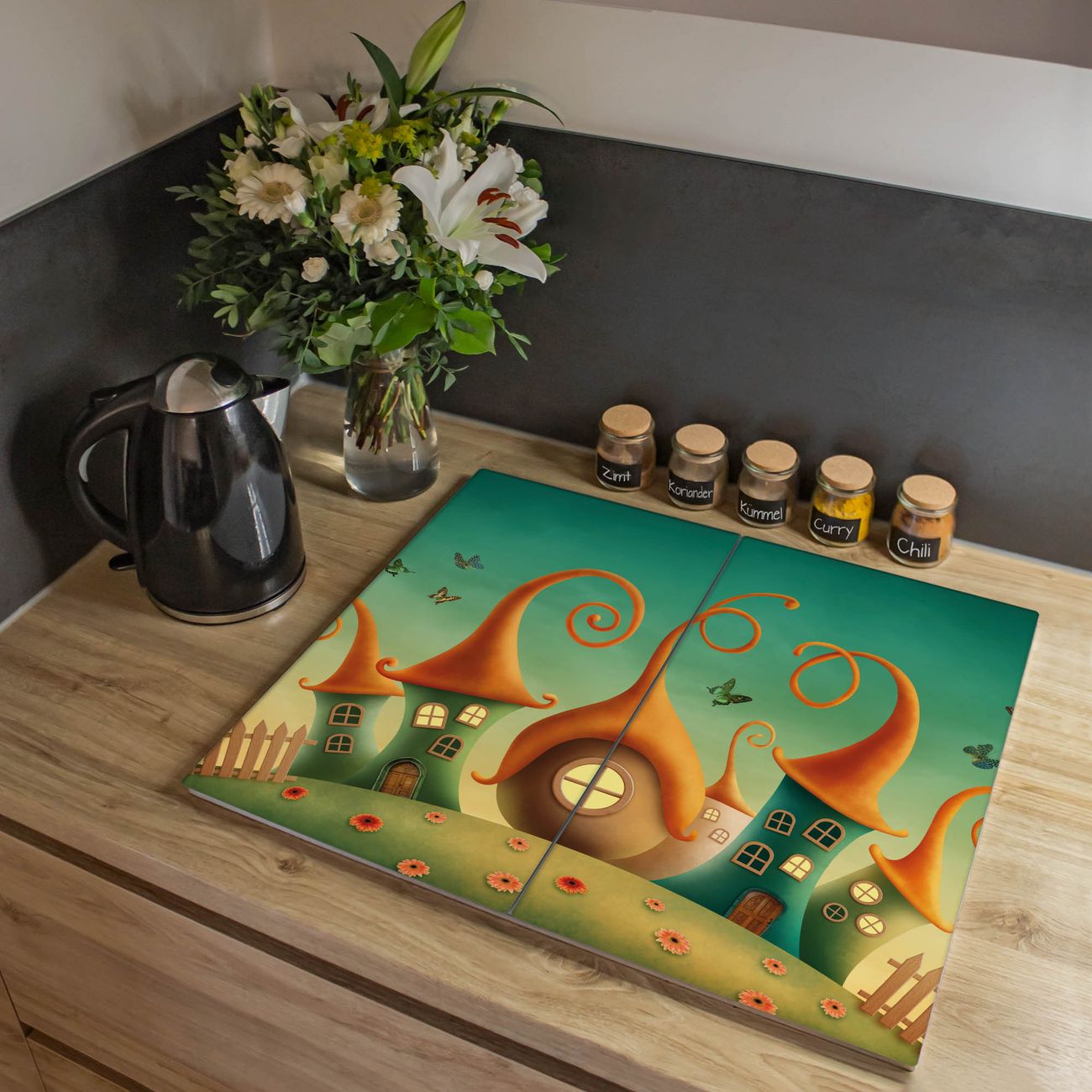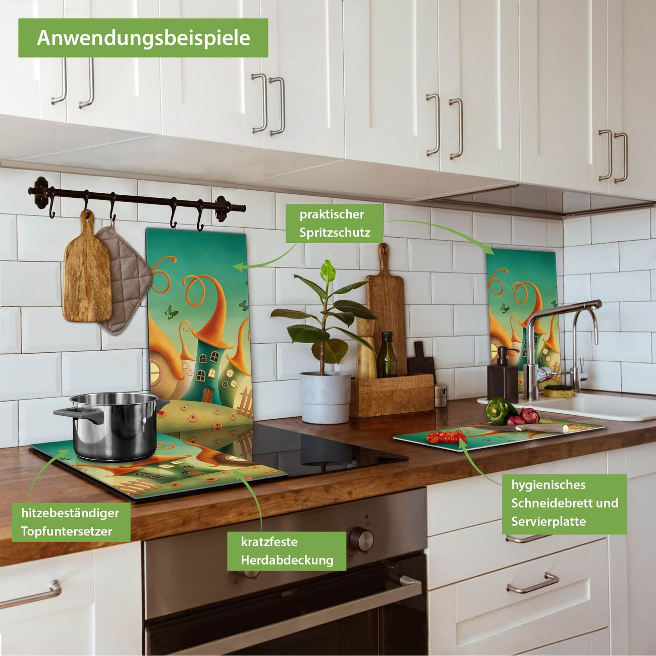 VIELSEITIG: Die Ceranfeldabdeckung ist vielseitig einsetzbar: ob als Spritzschutz hinter dem Herd für Ihre Küche oder als Glas Schneidebrett als hygienische und geruchsneutrale Unterlage. Sie können ebenfalls heiße Töpfe und Pfannen bis 100°C auf der Herdplattenabdeckung abstellen. Sie erhalten ein Multitalent für Ihre Küche. Die banjado Herdabdeckplatte aus Glas mit Motiv Zwergenhausen verdeckt mit einem schönen Motiv Ihr Ceranfeld bzw. Ihren Induktionsherd. Die Herdabdeckplatte ist vielseitig einsetzbar und passt sich dabei Ihrem Einrichtungsstil an. DESIGN: Die Herdabdeckung Zwergenhausen besteht aus hochwertigem, gehärtetem Glas mit einem unserer zahlreichen Motive. Sie haben die Wahl zwischen verschiedenen Maßen von einteiligen, zweiteiligen und einer dreiteiligen Herdabdeckung. Wählen Sie was zu Ihrer Einrichtung passt! DETAILS: Die Herdabdeckplatte ist vielseitig einsetzbar. Die Ecken sind für mehr Sicherheit dezent abgerundet, das Glas ist gehärtet. Sie erhalten separate Gummi Abstandshalter, damit Ihre Abdeckung rutschfest auf dem Herd steht. Diese können Sie frei positionieren, sodass die Herdabdeckung perfekt auf Ihrem Ceranfeld sitzt. BANJADO: Wir sind ein kleines Team aus dem Herzen von Sachsen und fertigen jeden Artikel nach Bestellung eigens für Sie an. Sie erhalten also keine preiswerte Importware, sondern Handarbeit. Auf Wunsch sind auch andere Farben und Größen möglich, kontakierten Sie uns gern.